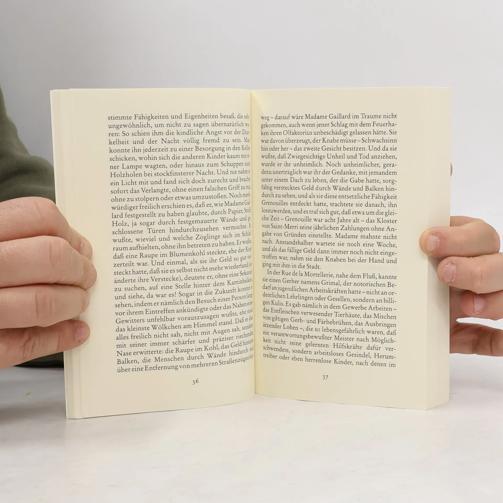 Von Jean-Baptiste Grenouille, dem finsteren Helden, sei nur verraten, daß er 1738 in Paris, in einer stinkigen Fischbude, geboren wird. Die Ammen, denen das Kerlchen an die Brust gelegt wird, halten es nur ein paar Tage mit ihm aus: Er sei zu gierig, außerdem vom Teufel besessen, wofür es untrügliche Indizien gebe: den fehlenden Duft, den unverwechselbaren Geruch, den Säuglinge auszuströmen pflegen.