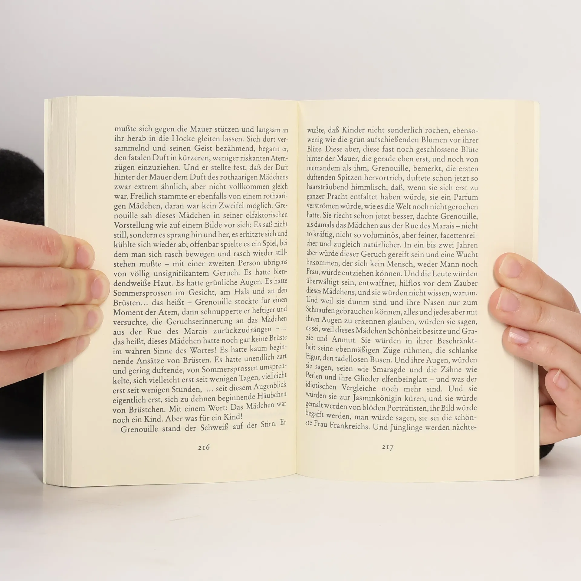 Von Jean-Baptiste Grenouille, dem finsteren Helden, sei nur verraten, daß er 1738 in Paris, in einer stinkigen Fischbude, geboren wird. Die Ammen, denen das Kerlchen an die Brust gelegt wird, halten es nur ein paar Tage mit ihm aus: Er sei zu gierig, außerdem vom Teufel besessen, wofür es untrügliche Indizien gebe: den fehlenden Duft, den unverwechselbaren Geruch, den Säuglinge auszuströmen pflegen.