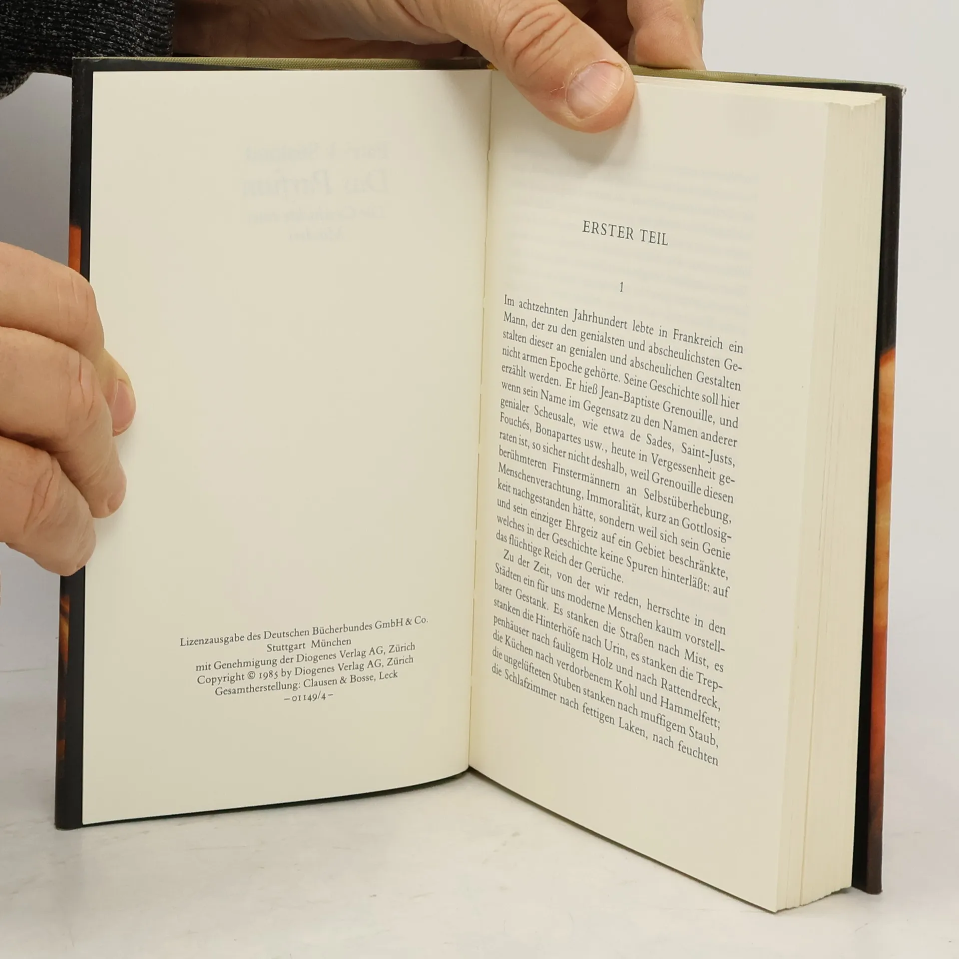 'Von Jean-Baptiste Grenouille, dem finsteren Helden, sei nur verraten, daß er 1738 in Paris, in einer stinkigen Fischbude, geboren wird. Die Ammen, denen das Kerlchen an die Brust gelegt wird, halten es nur ein paar Tage mit ihm aus: Er sei zu gierig, außerdem vom Teufel besessen, wofür es untrügliche Indizien gebe: den fehlenden Duft, den unverwechselbaren Geruch, den Säuglinge auszuströmen pflegen.'