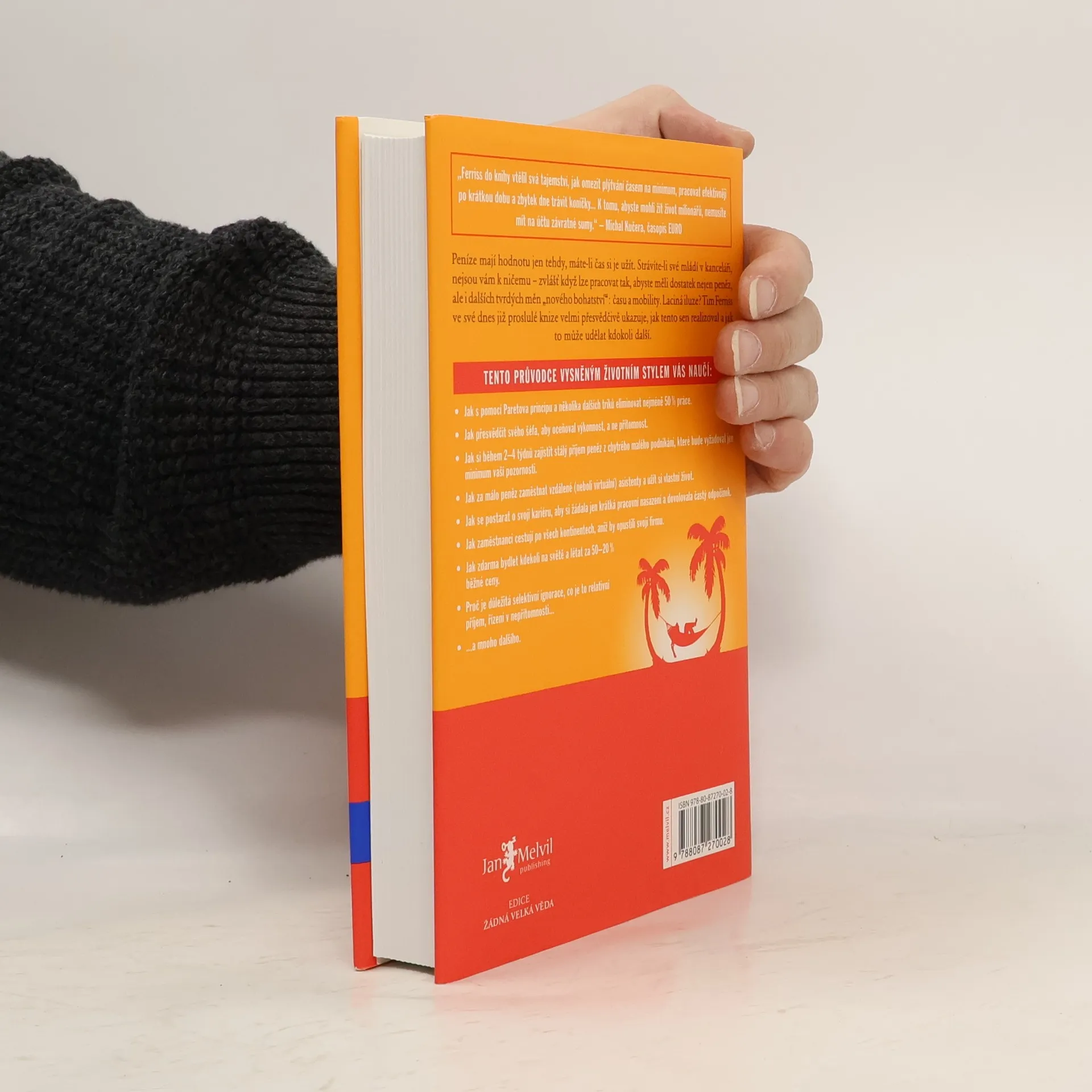 Peníze mají hodnotu jen tehdy, máte-li čas si je užít. Strávíte-li své mládí v kanceláři, nejsou vám k ničemu zvlášť když lze pracovat tak, abyste měli dostatek nejen peněz, ale i dalších tvrdých měn nového bohatství: času a mobility. Laciná iluze? Tim Ferriss ve své dnes již proslulé knize velmi přesvědčivě ukazuje, jak tento sen realizoval a jak to může udělat kdokoli další. Kniha je světovým bestsellerem a vyšla v 35 zemích.