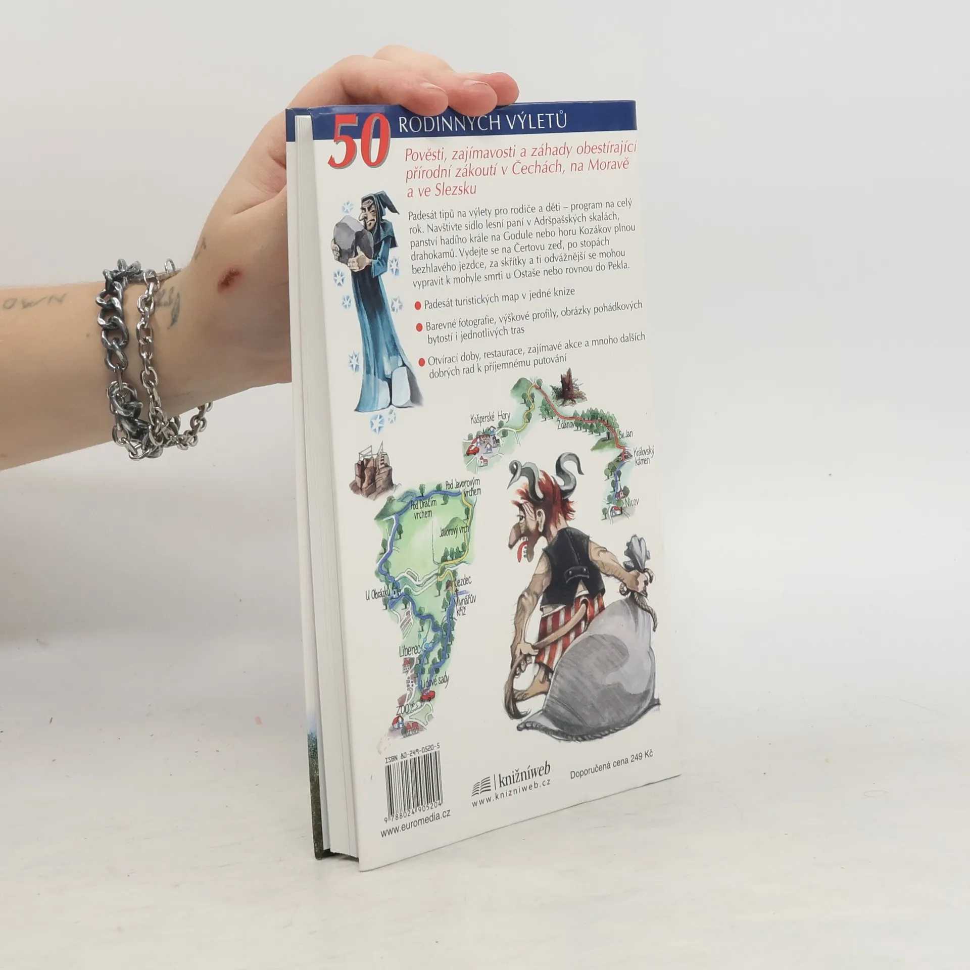 Pověsti, zajímavosti a záhady obestírající přírodní zákoutí v Čechách, na Moravě a ve Slezsku. Padesát tipů na výlety pro rodiče a děti - program na celý rok. Navštivte sídlo lesní paní v Adršpašských skalách, panství hadího krále na Godule nebo horu plnou drahokamů Kozákov. Vydejte se na Čertovu zeď, po stopách Divoké honby, za skřítky, ti odvážnější se mohou vypravit k mohyle smrti u Ostaše nebo rovnou do Pekla. Padesát turistických map v jedné knize. Barevné fotografie, výškové profily, obrázky pohádkových bytostí i jednotlivých tras, otvírací doby, restaurace, možnosti parkování, zajímavé akce a mnoho dalších dobrých rad k příjemnému putování. Oblasti: (Adršpašské skály, Bořeň, Boubín, Broumovské stěny, Býčí skála, Černá Studnice, Čertova ruka, Čertově stěna, Čertova zeď, Čertovo jezero, Čertovy kameny, Děčín - Pastýřská stěna, Dračí vrch, Girová, Godula, Hranická propast, Chlum u Třeboně, Jemčina, Jeskyně Hladomorna, Kašperské lesy, Klíč, Kostelec nad Černými lesy, Kozákov, Kryštofovo Údolí, Louky u Čermné, Lysá hora, Macocha, Měděnec, Ostaš, Pálava, Peklo, Plešivec, Potštátské skalní město, Praděd, Prachovské skály, Rejvíz, Říčky - Zakletý, Skalky skřítků, Smržovka - Vyhlídka, Sněžka, Suchý žleb, Tiské stěny, Údolí Křemelné, Vamberecké lesy, Velké Dářko, Velké Karlovice - Jezero, Venušiny misky, Vysoký kámen, Zbudovská blata, Zlatý kůň)... celý text