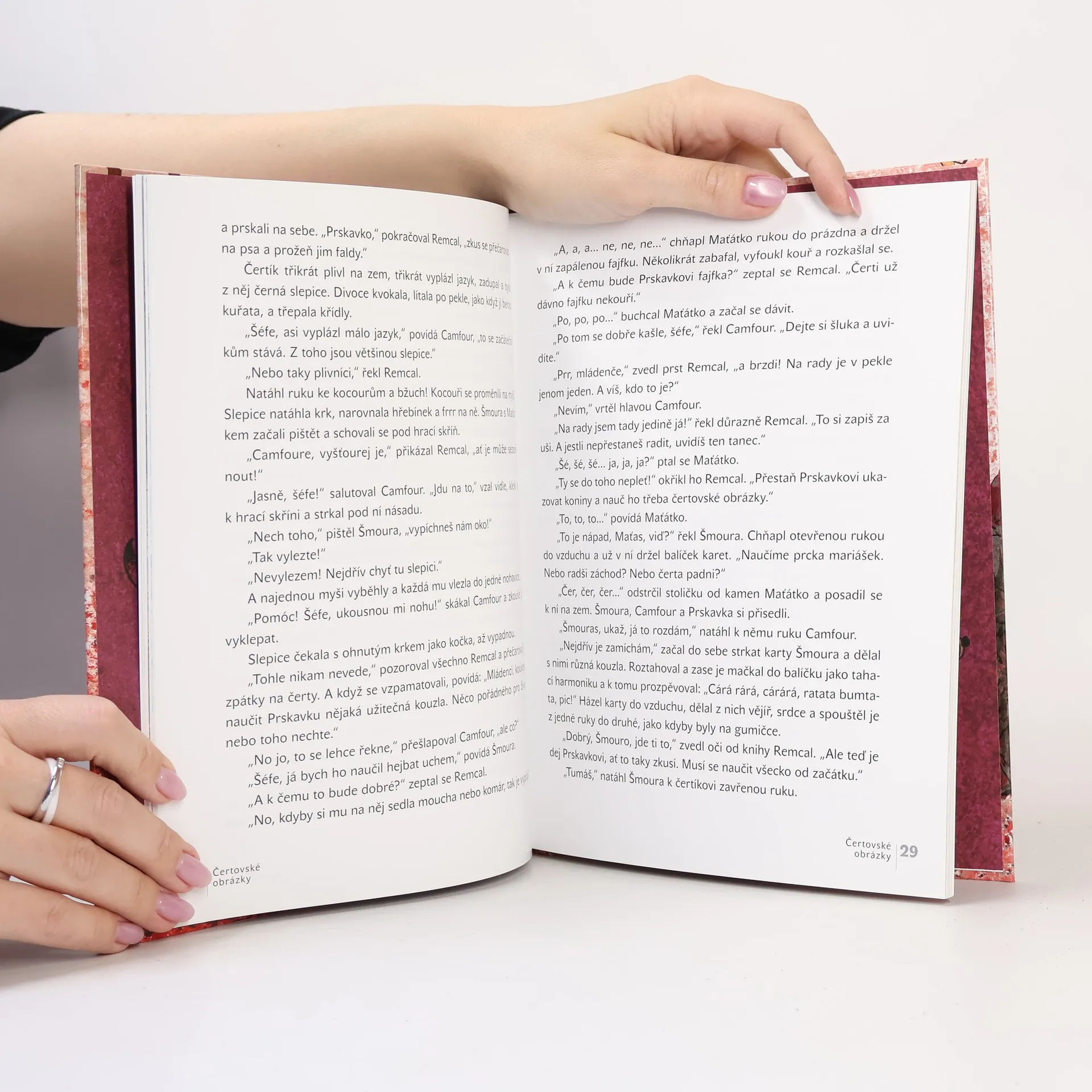 Mocný vládce Remcal, brepta Šmoura, kulhavý rozumbrada Camfour, koktavý Maťátko a malý neposeda Prskavka jsou pěkně povedená čertiska. Nejradši lenoší v teplém peklíčku, když však jde o něco dobrého na zub nebo nějakou lumpárničku, hned ožijí. A protože jsou to popletové, o rozruch a taškařice je postaráno. U všech čertů, to zas byla mela, když se vyhrnuli na svět! Jakmile se pořádně vyřádí, spokojeně zalezou zpátky do svých pelechů. A to by v tom byl čert, abyste se s touhle rohatou knížkou nepobavili!