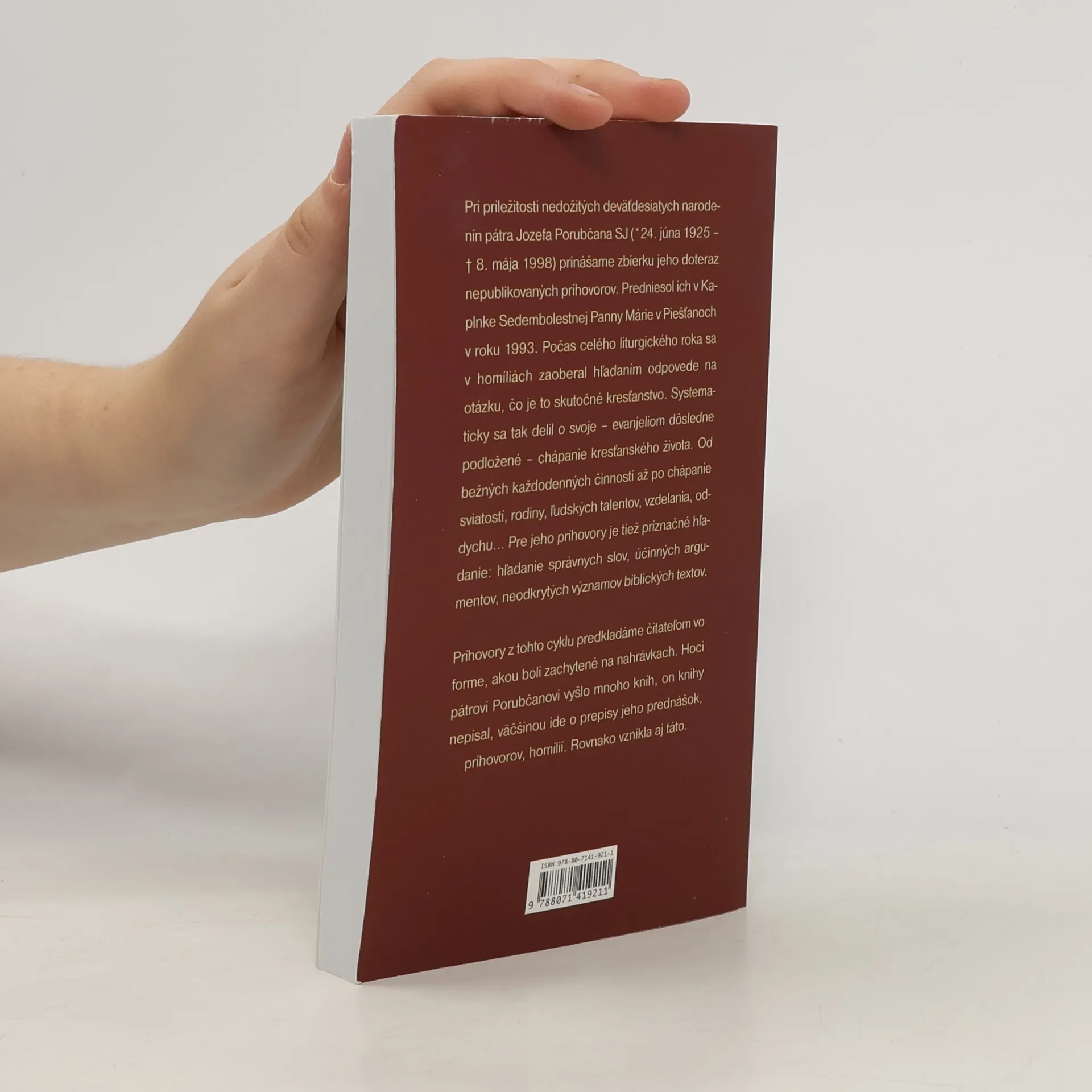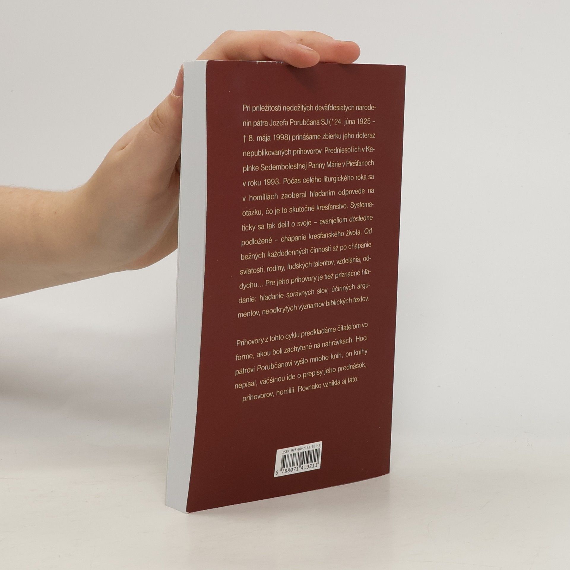 Nedeľné príhovory Pri príležitosti nedožitých deväťdesiatych narodenín pátra Jozefa Porubčana SJ (* 24. júna 1925 – † 8. mája 1998) prinášame zbierku jeho doteraz nepublikovaných príhovorov. Predniesol ich v Kaplnke Sedembolestnej Panny Márie v Piešťanoch v roku 1993. Počas celého liturgického roka sa v homíliách zaoberal hľadaním odpovede na otázku, čo je to skutočné kresťanstvo. Systematicky sa tak delil o svoje – evanjeliom dôsledne podložené – chápanie kresťanského života. Od bežných každodenných činností až po chápanie sviatostí, rodiny, ľudských talentov, vzdelania, oddychu... Pre jeho príhovory je tiež príznačné hľadanie: hľadanie správnych slov, účinných argumentov, neodkrytých významov biblických textov. Príhovory z tohto cyklu predkladáme čitateľom vo forme, akou boli zachytené na nahrávkach.