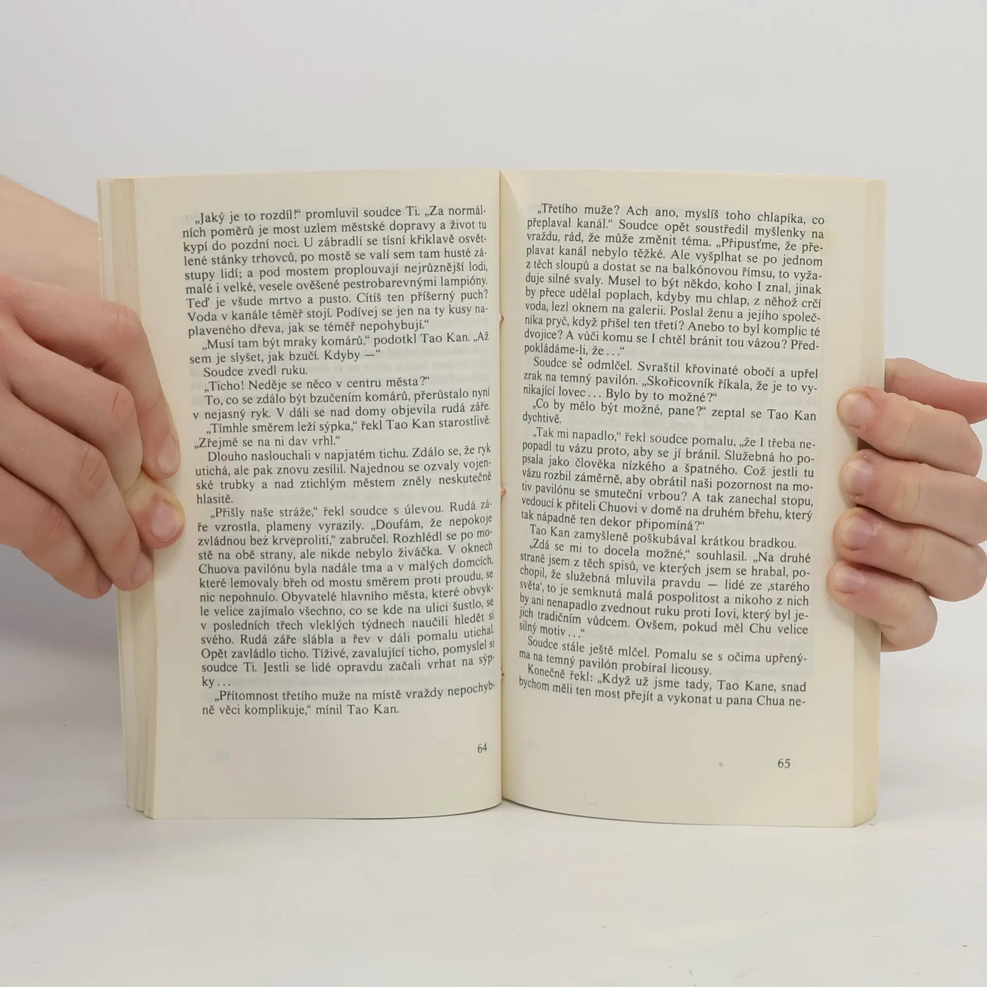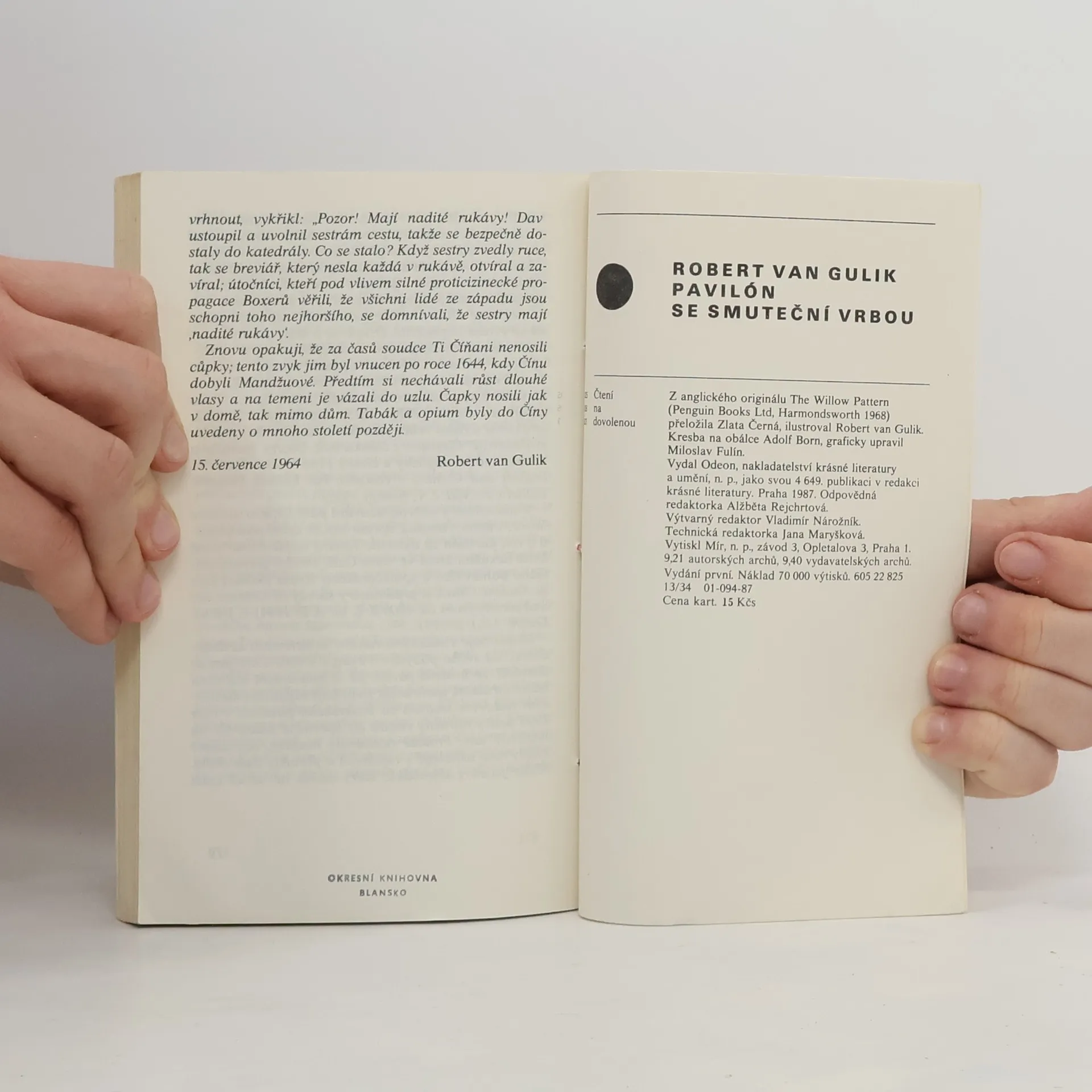 Tři případy, které opět řeší soudce Ti, se odehrávají v Číně v 7. století našeho letopočtu. Soudce Ti se zde za pomoci svých tří pomocníků zabývá vraždou potomků ze starých šlechtických rodů Ia a Meje, které spolu velice úzce souvisejí. Jakou roli v tom hraje motiv pavilónu se smuteční vrbou, loutkové divadlo, modrobílá porcelánová váza a kámen na roztírání tuše? Dovětek autora, černobílé autorovy ilustrace, na obálce ilustrace Adolfa Borna. 180 stran. Vydal Odeon v r. 1987 v edici Čtení na dovolenou.