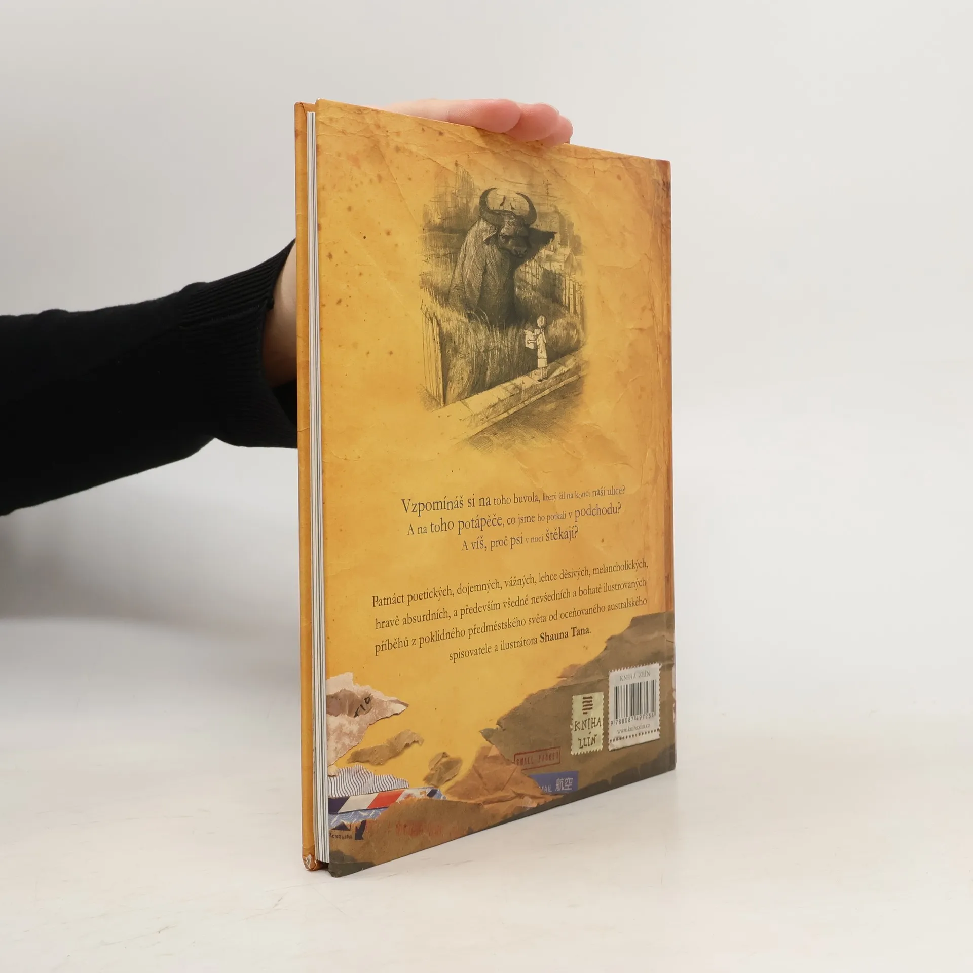 Příběhy z konce předměstí (2008) je antologie patnácti krátkých ilustrovaných povídek, které kombinují humor, poetiku, dojetí, vážnost, lehkou hrůzu, melancholii a absurdnost. Každý příběh se zaměřuje na podivné situace v běžném předměstském prostředí, jako je návštěva zahraničního studenta, dobrodružství dvou bratrů, obrovský dugong na trávníku, tajemný pokoj v domě, zlověstný stroj v parku nebo moudrý buvol na prázdné parcele. Klíčovým tématem je, jak obyčejní lidé reagují na tyto záhady a absurdity, a jak je jejich význam vnímán, ignorován nebo nepochopen. Tato mnohovrstevnatá kniha není určena pouze dětem nad 12 let, přesto získala řadu prestižních ocenění v kategorii knih pro děti a mládež. Shaun Tan (1974) vyrůstal na předměstí Perthu a vystudoval výtvarné umění a anglickou literaturu. Začínal jako ilustrátor hororových a sci-fi povídek, později se proslavil vlastními ilustrovanými knihami, které propojují společenská, politická a historická témata se surrealistickým viděním světa. Jeho díla, jako The Red Tree, The Lost Thing a The Arrival, mu přinesla mezinárodní uznání. Příběhy z konce předměstí jsou jeho poslední knihou, která byla oceněna v Austrálii, USA a Německu. V současnosti pracuje jako nezávislý umělec, spisovatel a režisér v Melbourne.