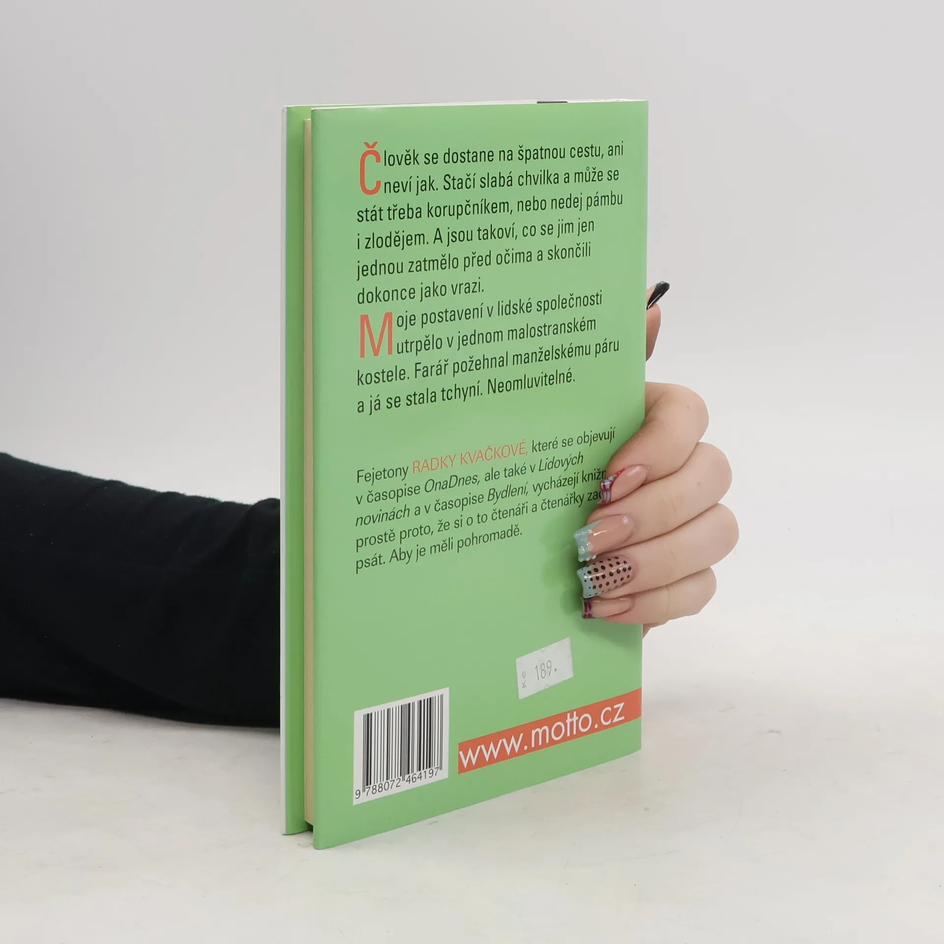 Člověk se dostane na špatnou cestu, ani neví jak. Stačí slabá chvilka a může se stát třeba korupčníkem, nebo nedej pámbu i zlodějem. A jsou takoví, co se jim jen jednou zatmělo před očima a skončili dokonce jako vrazi. Moje postavení v lidské společnosti utrpělo v jednom malostranském kostele. Farář požehnal manželskému páru a já se stala tchyní. Neomluvitelné.