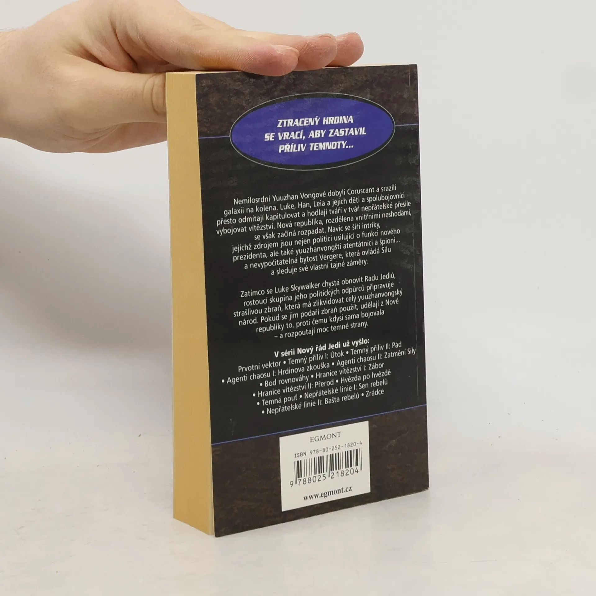 Ztracený hrdina se vrací, aby zastavil příliv temnoty... Nemilosrdní Yuuzhan Vongové dobyli Coruscant a srazili galaxii na kolena. Luke, Han, Leia a jejich děti a spolubojovníci přesto odmítají kapitulovat a hodlají tváří v tvář nepřátelské přesile vybojovat vítězství. Nová republika, rozdělena vnitřními neshodami, se však začíná rozpadat. Navíc se šíří intriky, jejichž zdrojem jsou nejen politici usilující o funkci nového prezidenta, ale také yuuzhanvongští atentátníci a špioni... a nevypočitatelná bytost Vergere, která ovládá Sílu a sleduje své vlastní tajné záměry. Zatímco se Luke Skywalker chystá obnovit Radu Jediů, rostoucí skupina jeho politických odpůrců připravuje strašlivou zbraň, která má zlikvidovat celý yuuzhanvongský národ. Pokud se jim podaří zbraň použít, udělají z Nové republiky to, proti čemu kdysi sama bojovala - a rozpoutají moc temné strany.