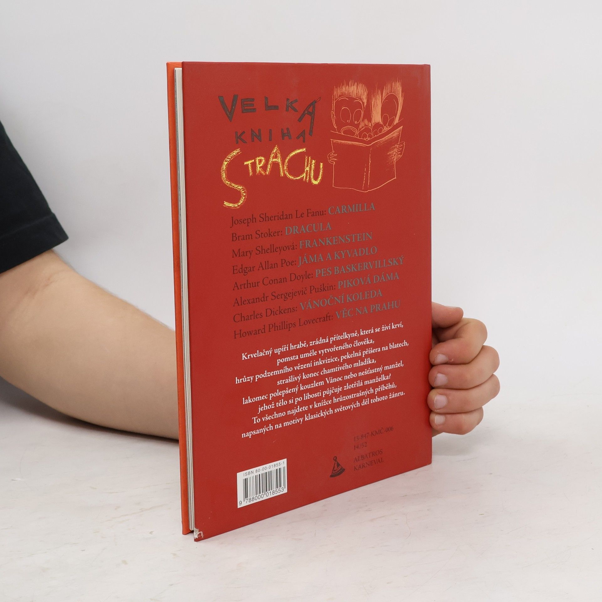 Krvelační upíří hrabě, zrádná přítelkyně, která se živí krví, pomsta uměle vytvořeného člověka, hrůzy podzemního vězení inkvizice, pekelná příšera na blatech, strašlivý konec chamtivého mladíka, lakomec polepšený kouzlem Vánoc nebo nešťastný manžel, jehož tělo si po libosti půjčuje zlotřilá manželka? To všechno najdete v knížce hrůzostrašných příběhů, napsaných na motivy klasických světových děl tohoto žánru. Příběhy, při jejichž čtení naskakuje husí kůže, lákaly a lákají autory od nepaměti. A čtenáři je s velikou oblibou hltají ve volných chvílích. Proto vznikl i sborník Velká kniha Strachu, ve kterém najdete zjednodušené verze klasických hrůzostrašných příběhů od slavných spisovatelů. Nepostradatelná knížka pro všechny, kdo se rádi bojí. Sestavila a převyprávěla Veronika Bohatá Povídky: - Joseph Sheridan Le Fanu: Carmilla - Bram Stoker: Dracula - Mary W. Shelley: Frankenstein - Edgar Allan Poe: Jáma a kyvadlo - Arthur Conan Doyle: Pes baskervillský - Alexandr Sergejevič Puškin: Piková dáma - Charles Dickens: Vánoční koleda - Howard Phillips Lovecraft: Věc na prahu