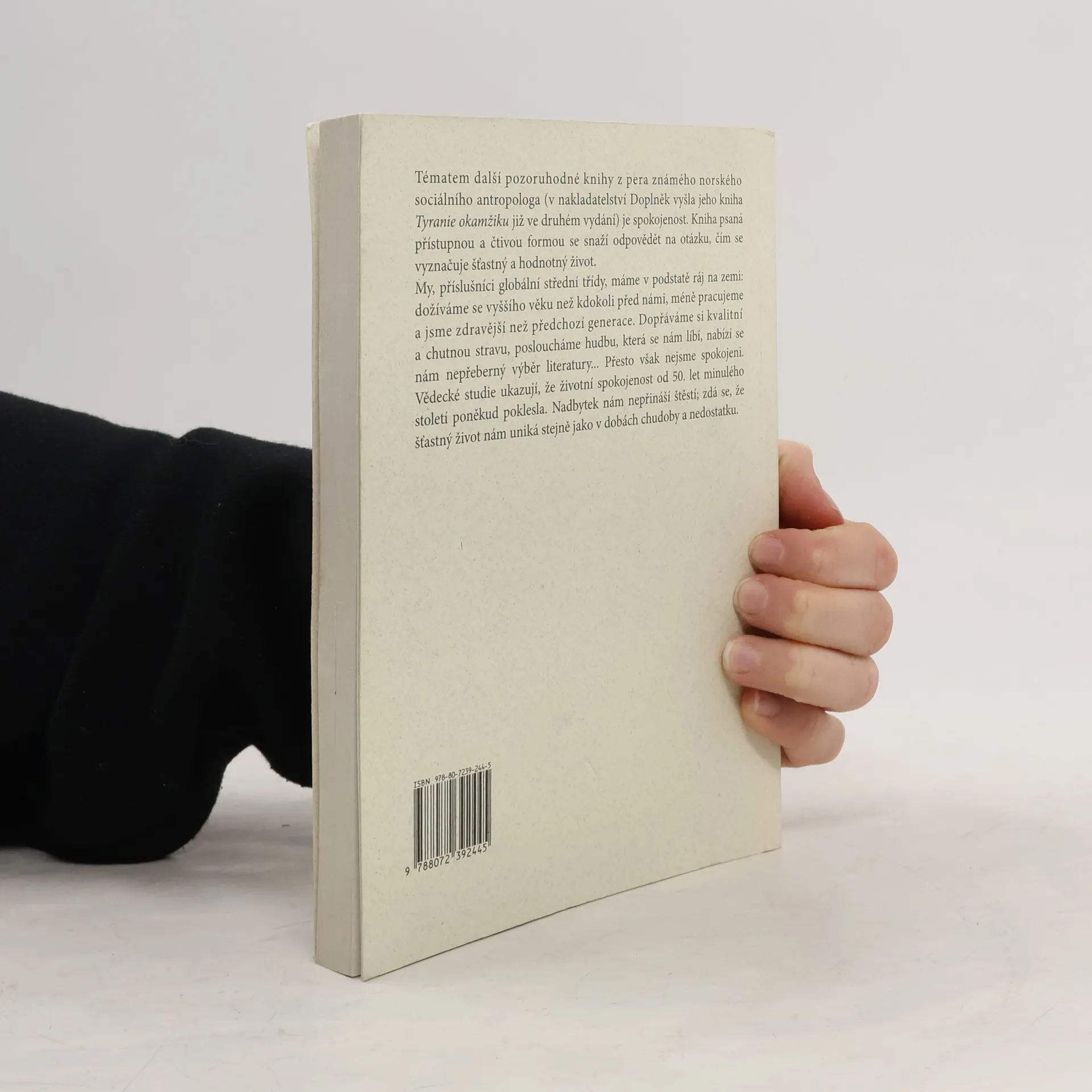 Tématem další pozoruhodné knihy z pera známého norského sociálního antropologa (v Doplňku již vyšla jeho kniha Tyranie okamžiku) je spokojenost. Kniha psaná přístupnou a čtivou formou se snaží odpovědět na otázku, čím se vyznačuje šťastný a hodnotný život. My, příslušníci globální střední třídy, máme v podstatě ráj na zemi: dožíváme se vyššího věku než kdokoli před námi, méně pracujeme a jsme zdravější než předchozí generace. Dopřáváme si kvalitní a chutnou stravu, posloucháme hudbu, která se nám líbí, nabízí se nám nepřeberný výběr literatury… Přesto však nejsme spokojeni. Vědecké studie ukazují, že životní spokojenost od 50. let minulého století poněkud poklesla. Nadbytek nám nepřináší štěstí. Zdá se, že šťastný život nám uniká stejně jako v dobách chudoby a nedostatku.