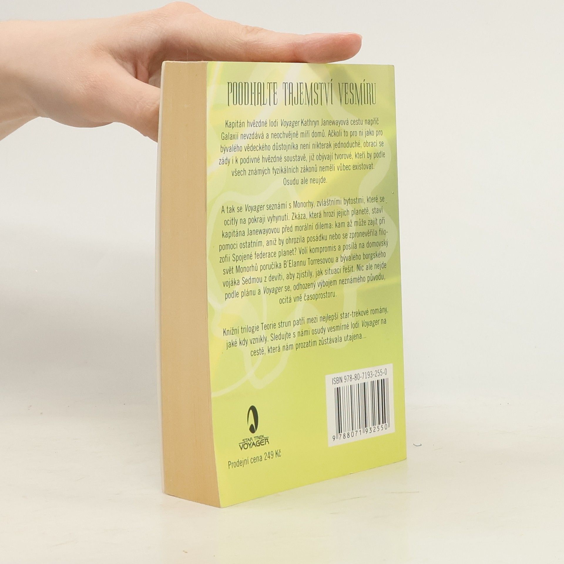 Kapitán hvězdné lodi Voyager Kathryn Janewaová cestu napříč Galaxií nevzdává a neochvějně míří domů. Ačkoli to pro ni jak pro bývalého vědeckého důstojníka není nikterak jednoduché, obrací se zády i k podivné hvězdné soustavě, již obývají tvorové, kteří by podle všech známých fyzikálních zákonů neměli vůbec existovat. Osudu ale neujde. A tak se Voyager seznámí s Monorhy, zvláštními bytostmi, které se ocitly na pokraji vyhynutí. Zkáza, která hrozí jejich planetě, staví kapitána Janewayovou před morální dilema: kam až může zajít při pomoci ostatním, aniž by ohrozila posádku nebo se zpronevěřila filozofii Spojené federace planet? Volí kompromis a posílá na domovský svět Monorhů poručíka B'Elannu Torresovou a bývalého borgského vojáka Sedmou z devíti, aby zjistily, jak situaci řešit. Nic ale nejde podle plánu a Voyager se, odhozený výbojem neznámého původu, ocitá vně časoprostoru. Knižní trilogie Teorie strun patří mezi nejlepší star-trekové romány, jaké kdy vznikly. Sleduje s námi osudy vesmírné lodi Voyager na cestě, která nám prozatím zůstává utajena...