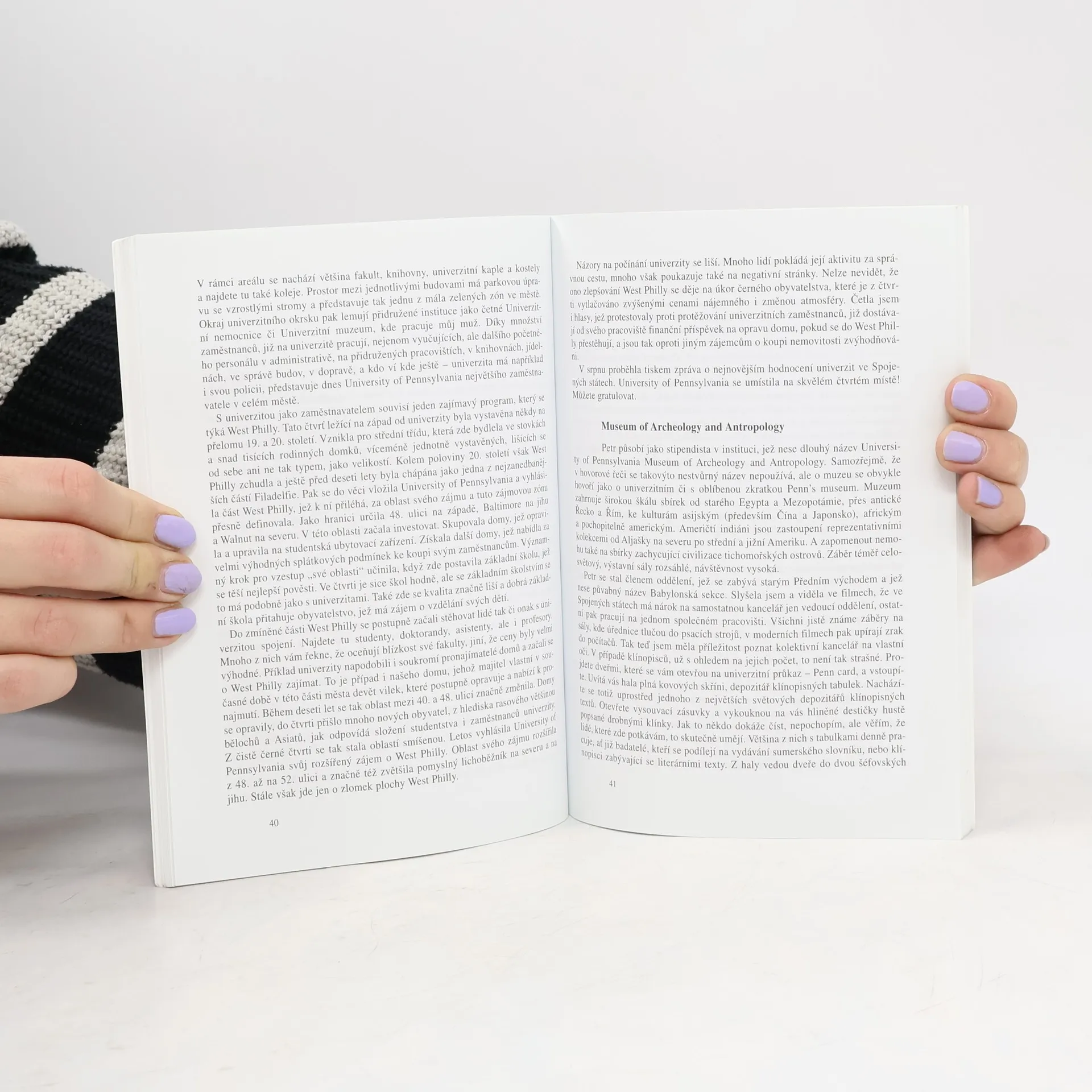 Autorka, univerzitní profesorka, vtipně popisuje dojmy z Filadelfie a i jiných států USA, kde spolu s manželem prožila celý rok. “Amerika, jak jsem ji zatím viděla, je taková chudší a špinavější sestra západní Evropy“. Ale zdaleka nejde pouze o kritiku této velmoci. Pochvalně se autorka zmiňuje např. o úrovni americké digitalizace, o amerických muzeích a akváriích…