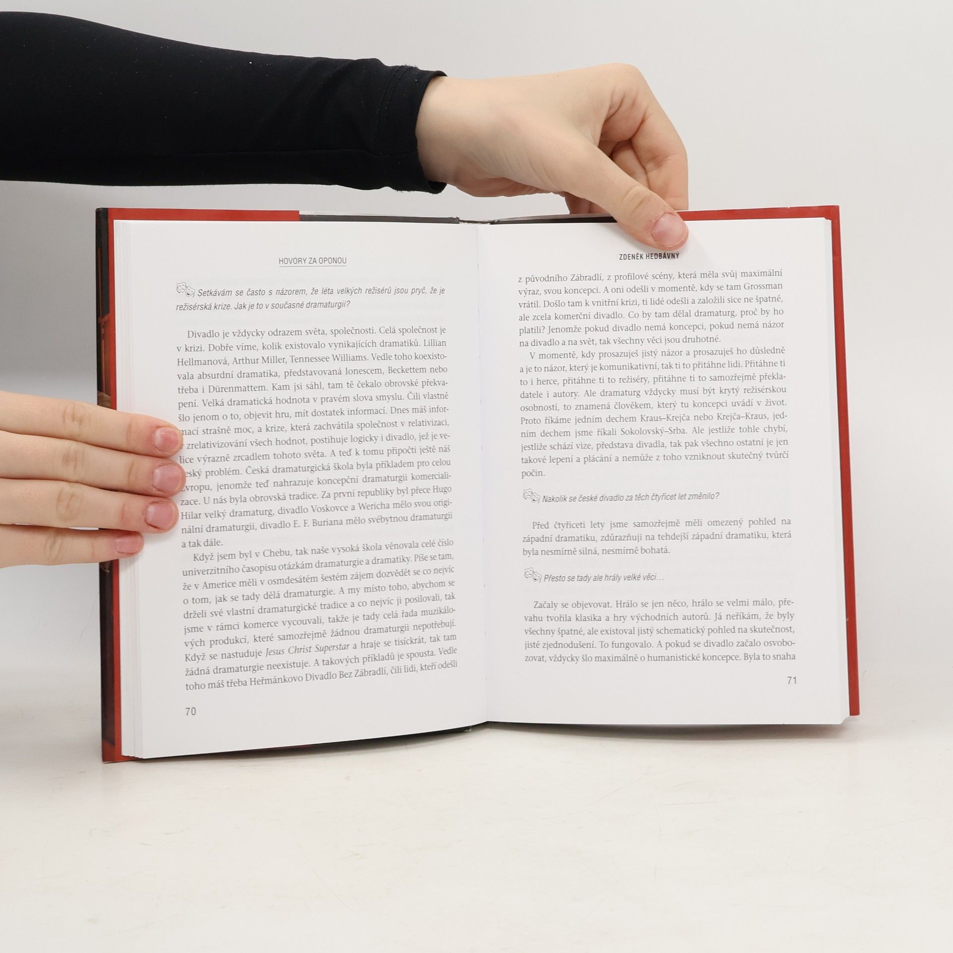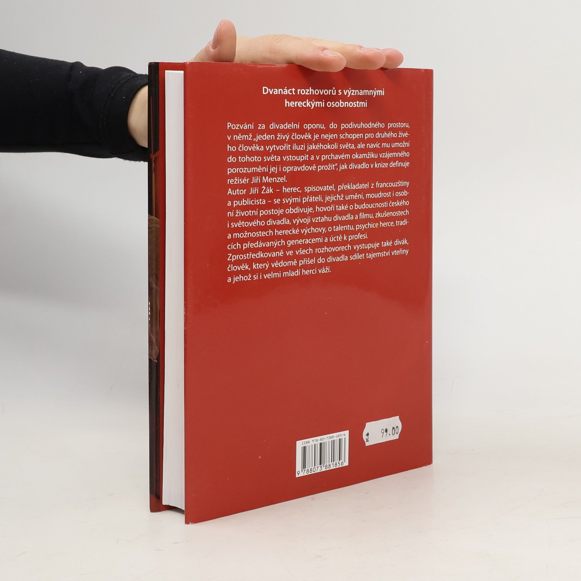 Kniha obsahuje dvanáct rozhovorů s významnými divadelními osobnostmi (Věra Galatíková, Boris Rösner, Zdeněk Hedbávný, Jiří Kodet, Jiří Menzel, Jan Grygar, Filip Blažek, Otakar Brousek, Otakar Brousek ml., Pavel Dostál, František Němec, Viktor Preiss). Pozvání za divadelní oponu, do podivuhodného prostoru, v němž „jeden živý člověk je nejen schopen pro druhého živého člověka vytvořit iluzi jakéhokoli světa, ale navíc mu umožní do tohoto světa vstoupit a v prchavém okamžiku vzájemného porozumění jej i opravdově prožít“, jak divadlo v knize definuje režisér Jiří Menzel. Autor Jiří Žák – herec, spisovatel, překladatel z francouzštiny a publicista – se svými přáteli, jejichž umění, moudrost i osobní životní postoje obdivuje, hovoří také o budoucnosti českého i světového divadla, vývoji vztahu divadla a filmu, zkušenostech a možnostech herecké výchovy, o talentu, psychice herce, tradicích předávaných generacemi a úctě k profesi. Zprostředkovaně ve všech rozhovorech vystupuje také divák, člověk, který vědomě přišel do divadla sdílet tajemství vteřiny a jehož si i velmi mladí herci váží.