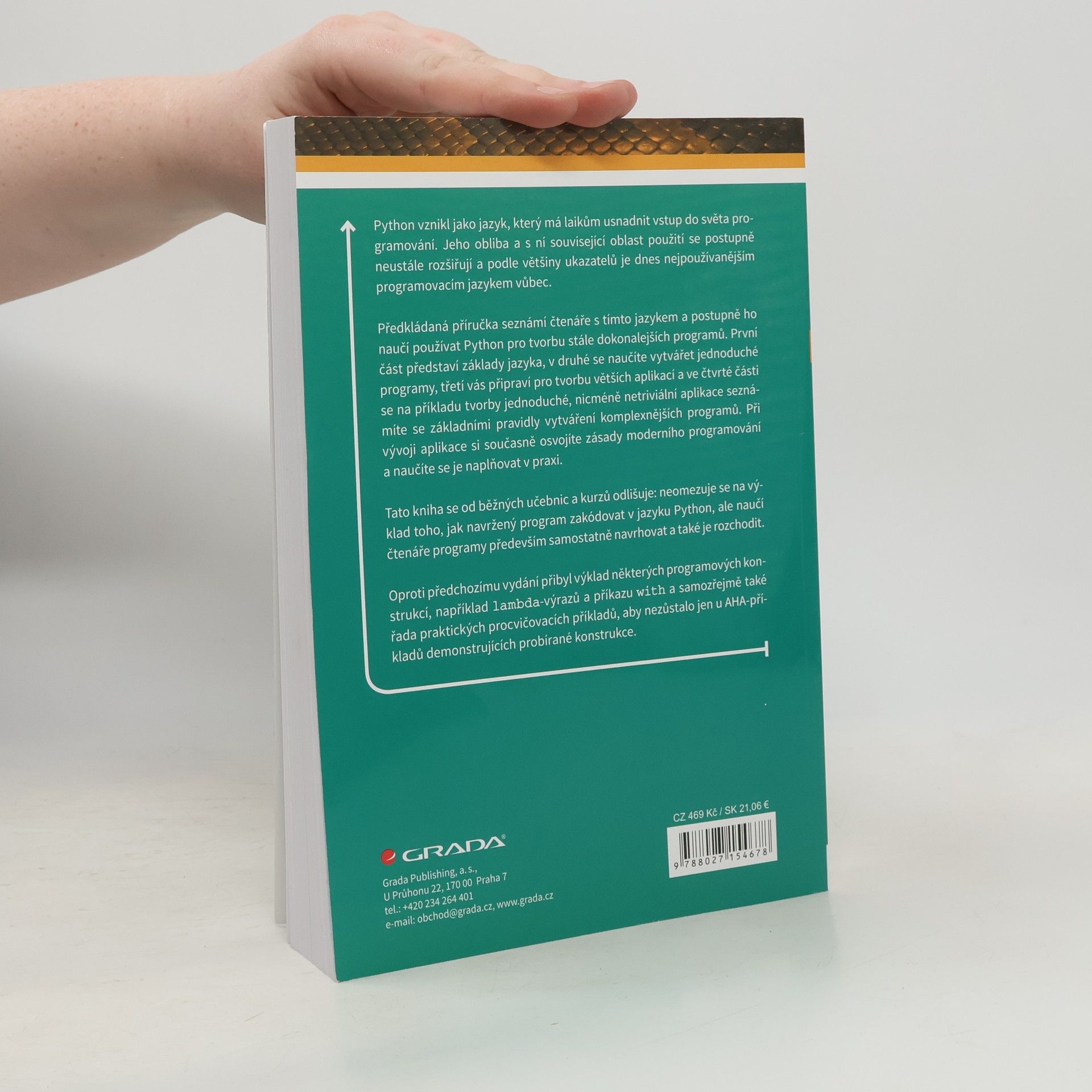 Python vznikl jako jazyk, který má laikům usnadnit vstup do světa programování. Jeho obliba a s ní související oblast použití se postupně neustále rozšiřují a podle většiny ukazatelů je dnes nejpoužívanějším programovacím jazykem vůbec. Předkládaná příručka seznámí čtenáře s tímto jazykem a postupně ho naučí používat Python pro tvorbu stále dokonalejších programů. První část představí základy jazyka, v druhé se naučíte vytvářet jednoduché programy, třetí vás připraví pro tvorbu větších aplikací a ve čtvrté části se na příkladu tvorby jednoduché, nicméně netriviální aplikace seznámíte se základními pravidly vytváření komplexnějších programů. Při vývoji aplikace si současně osvojíte zásady moderního programování a naučíte se je naplňovat v praxi. Tato kniha se od běžných učebnic a kurzů odlišuje: neomezuje se na výklad toho, jak navržený program zakódovat v jazyku Python, ale naučí čtenáře programy především samostatně navrhovat a také je rozchodit. Oproti předchozímu vydání přibyl výklad některých programových konstrukcí, konkrétně příkazu with a samozřejmě také řada praktických procvičovacích příkladů, aby nezůstalo jen u AHA–příkladů demonstrujících probírané konstrukce.