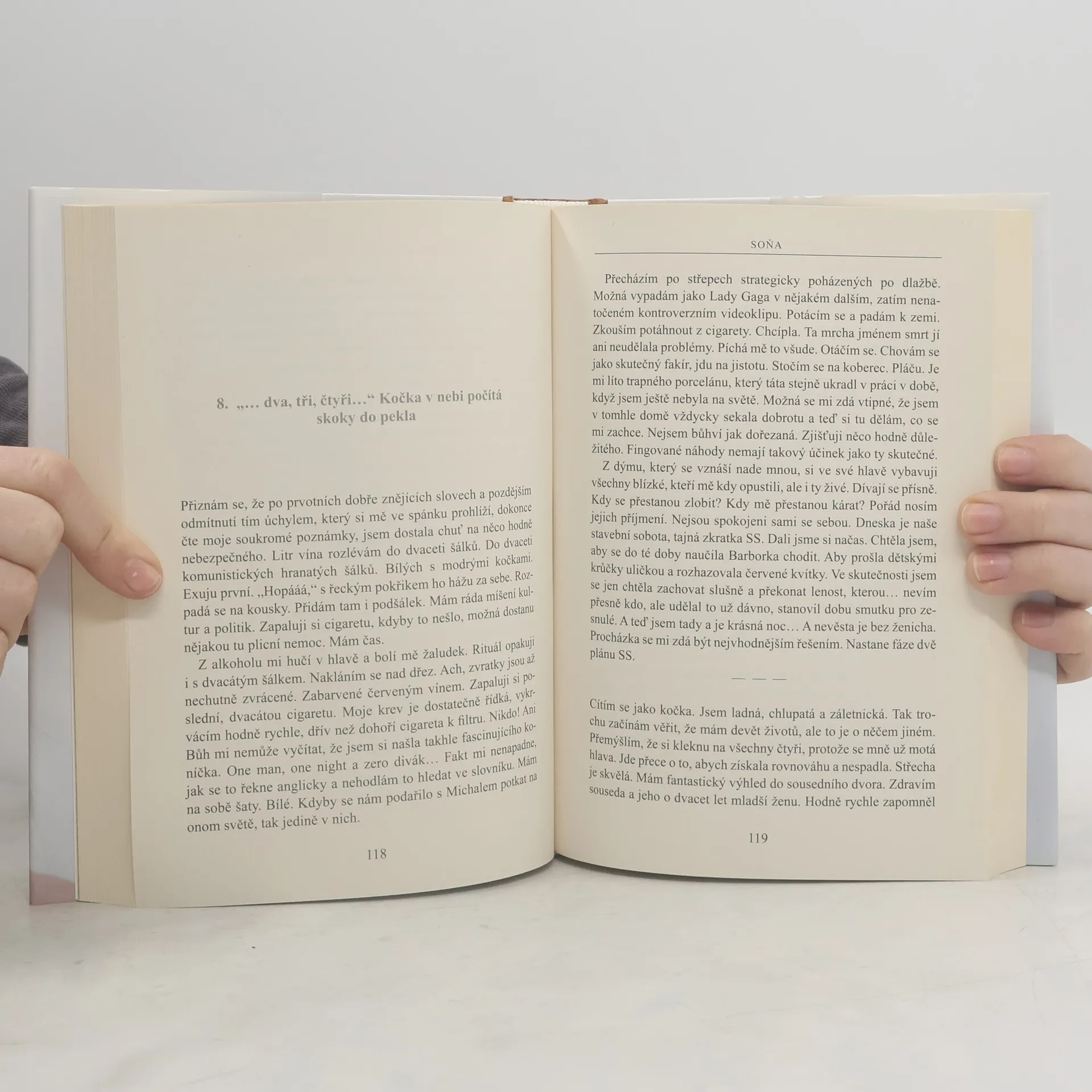 Soňa potká muže, na kterém poprvé nenachází žádnou podobnost se svým tyranským, hluboce věřícím otcem. Michal je potetovaný, v uších mu září náušnice, na krku nosí růženec se zirkony a vůbec netuší, jak ho používat, Soňu však předsudky, kterými ji od malička krmili, neodradí. Nejdříve z něj má strach, ale pak se s ním spřátelí. A může začít nový život! Po chmurné životní dekádě doufá, že jí bůh přinese štěstí. Ale na jak dlouho? Neodvratitelná série osudových ran ji o všecko připraví. I o zdravý rozum. Nezavazuje si tkaničky u bot a doufá, že klopýtne, nešťastně spadne a už nikdy neotevře oči… Štěstí se mění na bolest a Soňu pronásleduje touha zemřít. Neznámý mladík ji však ze životní nerovnováhy vyvede. Je právě on její poslední naděje?