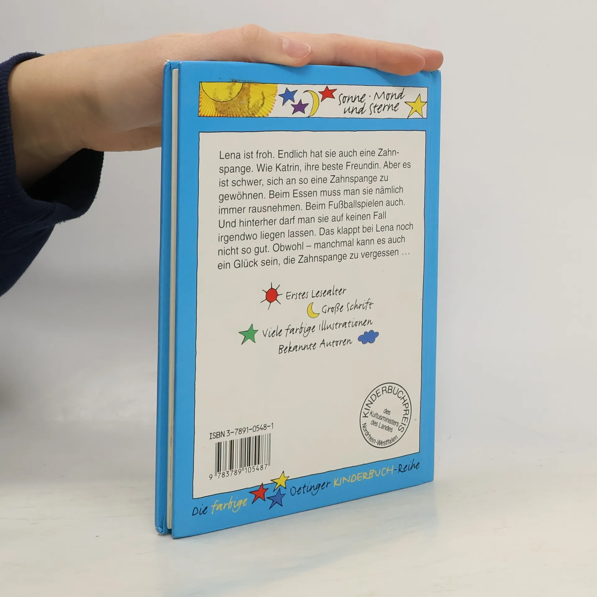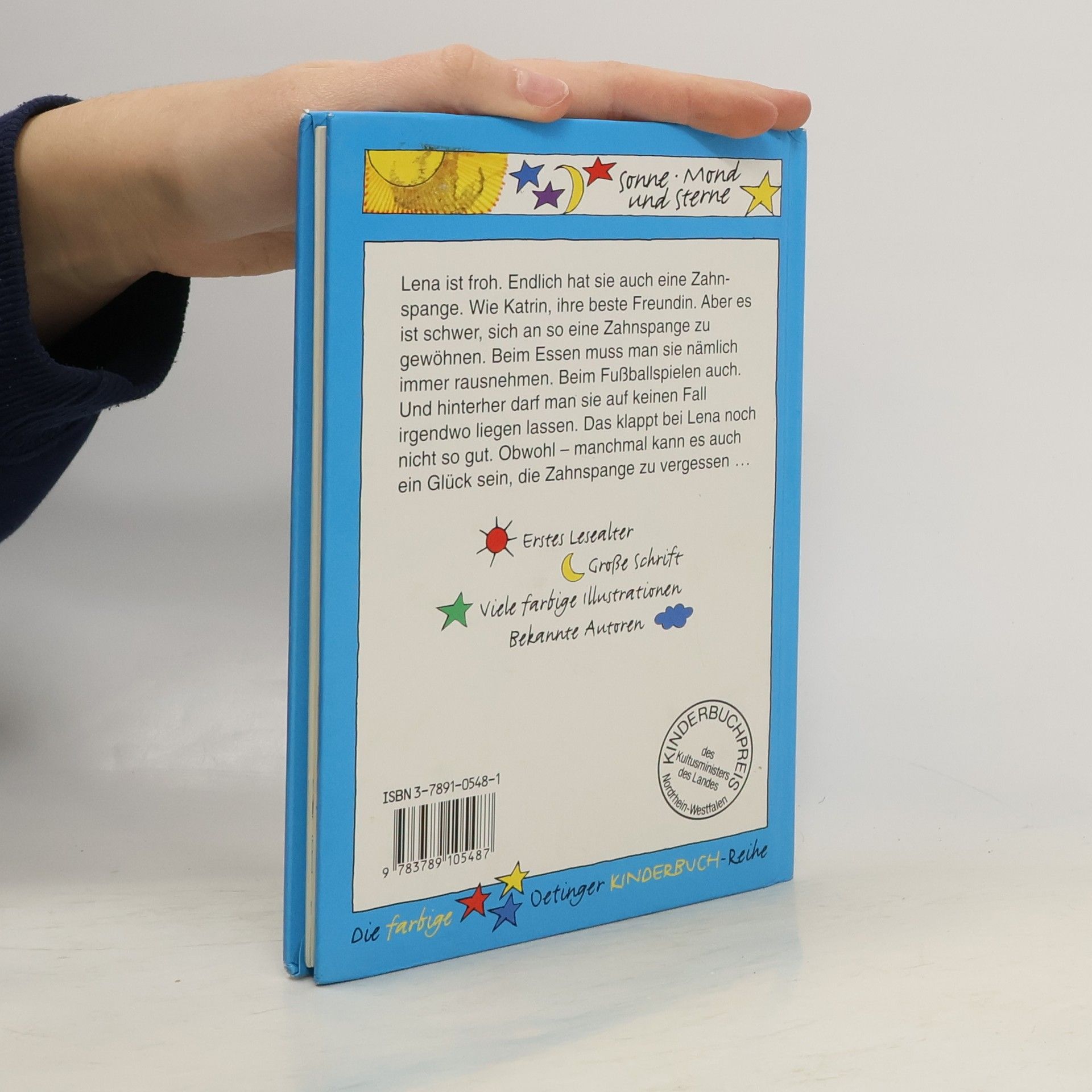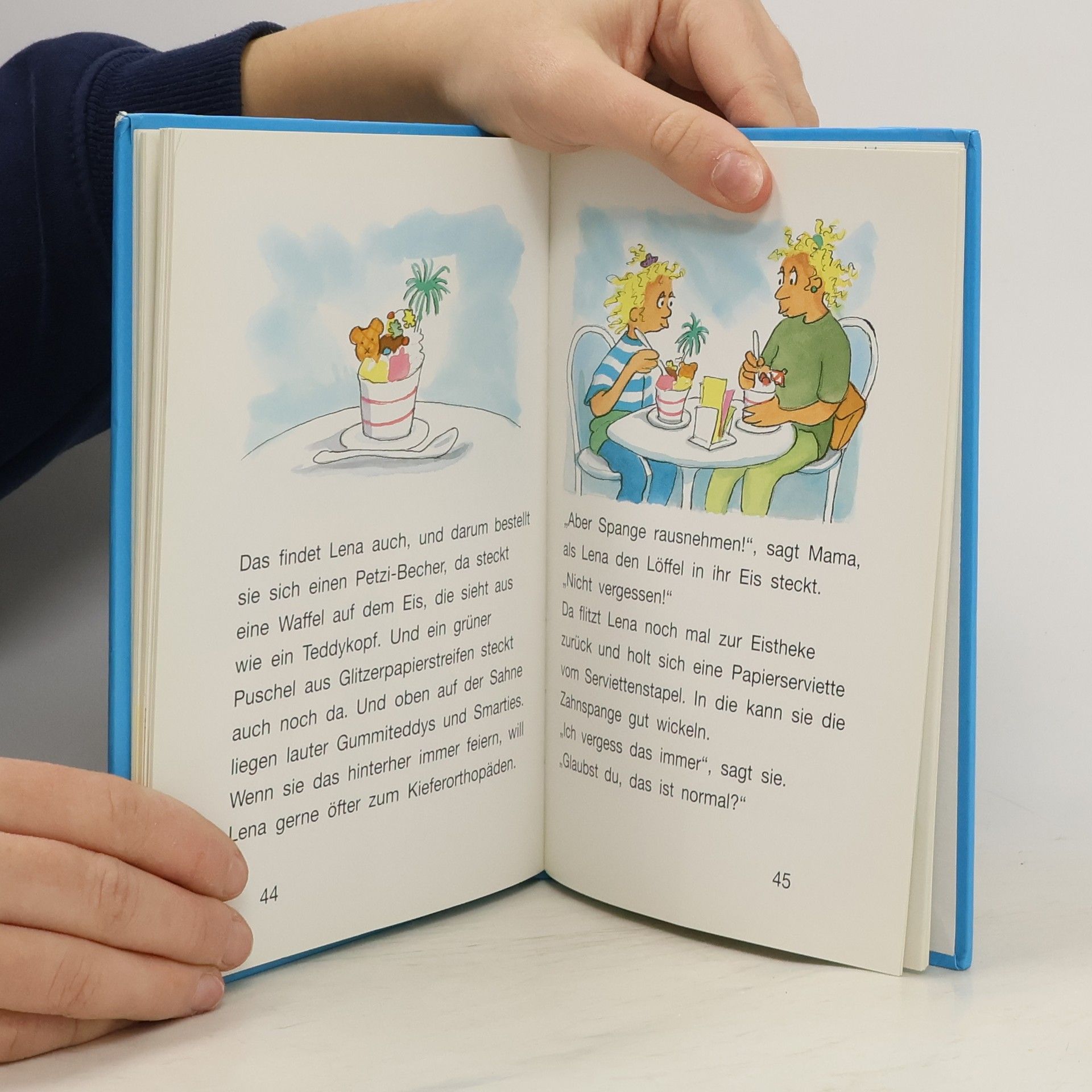 Neues von Lena und ihrer besten Freundin Katrin. Lena ist froh. Endlich hat sie auch eine Zahnspange. Wie Katrin, ihre beste Freundin. Die Farbe durfte sie selber aussuchen. Da hat sie Durchsichtig-Türkis genommen mit einem winzig kleinen Bild drin. Auf dem Bild ist ein galoppierendes Pferd. Das sieht so schön aus, dass Lena es am liebsten immerzu angucken würde. Aber dazu ist eine Zahnspange natürlich nicht da. Und wenn Lena sie im Mund hat, ist das Pferd sowieso hinter ihren Zähnen verschwunden. Es ist schwer, sich an so eine Zahnspange zu gewöhnen. Beim Essen muss man sie nämlich immer rausnehmen. Beim Fußballspielen auch. Und hinterher darf man sie auf keinen Fall irgendwo liegen lassen. Das klappt bei Lena noch nicht so gut. Obwohl - manchmal kann es auch ein Glück sein, die Zahnspange zu vergessen ...