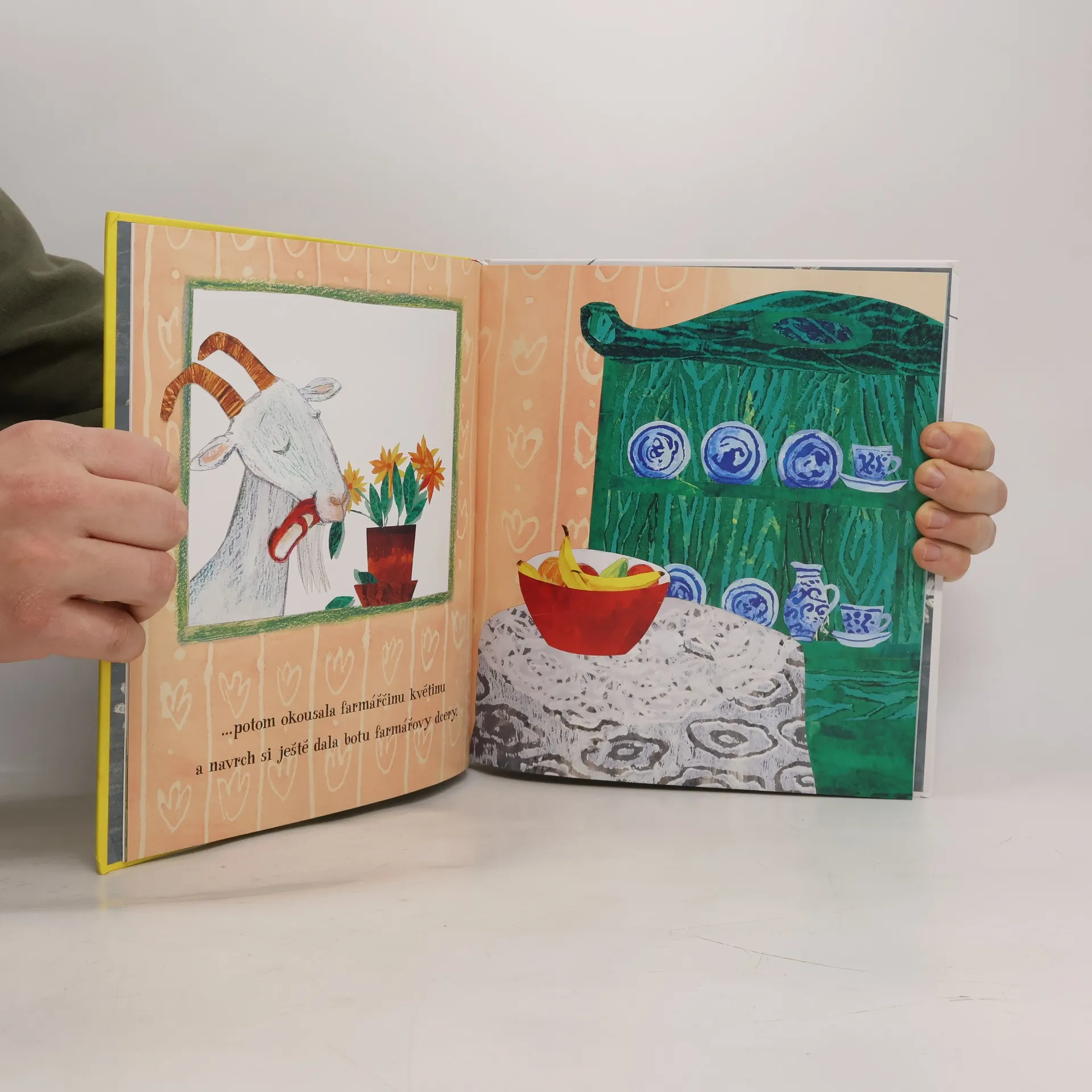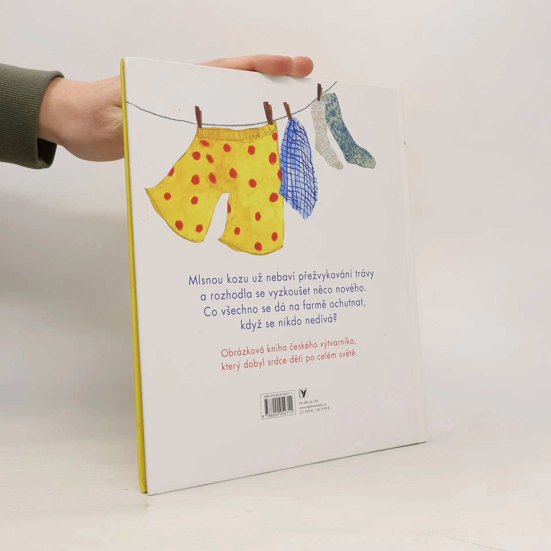Mlsnou kozu nebaví přežvykování trávy, a tak se rozhodne vyzkoušet něco nového. Obejde celý statek, kočce vypije mléko, spořádá prasátku bramborové slupky, farmářově dcerce slupne botu a farmářovi dokonce trenýrky. Není divu, že se jí udělá špatně. Zezelená, zežloutne, zmodrá… A léčí se z toho celý týden – v pondělí přestane škytat, v úterý se jí přestane motat hlava, ve středu si mohutně říhne… A o víkendu už je to zas ta stará nepoučitelná koza. Dokud nenajde opuštěnou holinku...