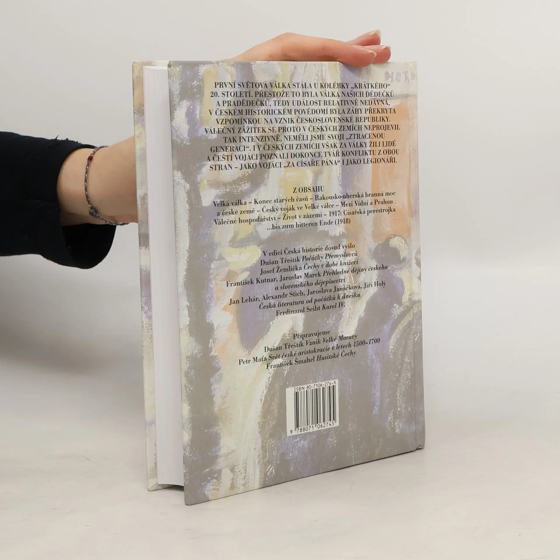 První světová válka stála u kolébky „krátkého“ 20. století. Přestože to byla válka našich dědečků a pradědečků, tedy událost relativně nedávná, v českém historickém povědomí byla záhy překryta vzpomínkou na vznik Československé republiky. I v českých zemích však za války žili lidé, a čeští vojáci poznali dokonce tvář konfliktu z obou stran – jako vojáci „za císaře pána“ i jako legionáři. Ovlivnila válka i českou společnost tak, že to mělo vliv na její další vývoj ve 20. století? Na tuto a podobné otázky se snaží autor odpovědět v knize, v níž části chronologické – od sarajevského atentátu až po rozpad monarchie a vznik samostatného státu – kombinuje s kapitolami, které přibližují hlavní stránky života tehdejší společnosti, hospodářství, kulturu, politickou a sociální každodennost. Jádro práce spočívá v rozboru událostí v zázemí, všímá si také české účasti na válečných operacích.