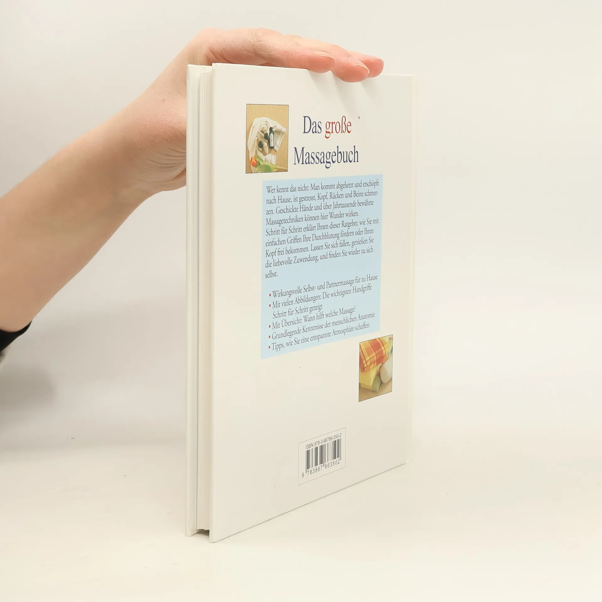 Wer kennt das nicht: Man kommt abgehetzt und erschöpft nach Hause, ist gestresst, Kopf, Rücken und Beine schmerzen. Geschickte Hände und über Jahrtausende bewährte Massagetechniken können hier Wunder wirken. Schritt für Schritt erklärt Ihnen dieser Ratgeber, wie Sie mit einfachen Griffen Ihre Durchblutung fördern oder Ihren Kopf frei bekommen. Lassen Sie sich fallen, genießen Sie die liebevolle Zuwendung, und finden Sie wieder zu sich selbst.§§- Wirkungsvolle Selbst- und Partnermassage für zu Hause§- Mit vielen Abbildungen: Die wichtigsten Handgriffe Schritt für Schritt gezeigt§- Mit Übersicht: Wann hilft welche Massage?§- Grundlegende Kenntnisse der menschlichen Anatomie§- Tipps, wie Sie eine entspannte Atmosphäre schaffen