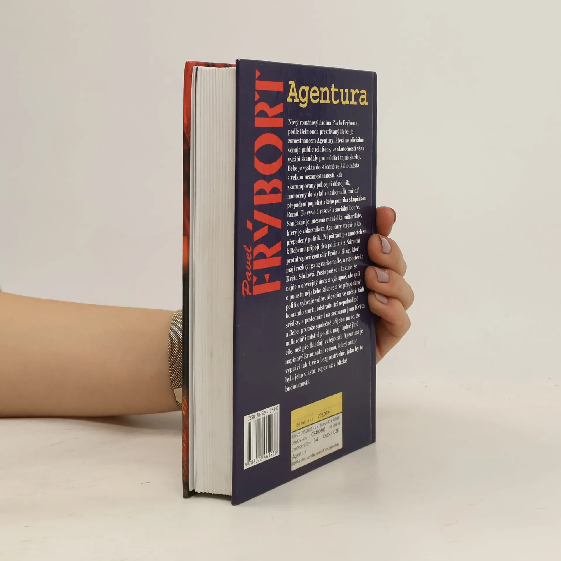 Nový románový hrdina Pavla Frýborta, podle Belmonda přezdívaný Bebe, je zaměstnancem Agentury, který se oficiálně věnuje public relations, ve skutečnosti však vyrábí skandály pro média a i tajné služby. Bebe je vyslán do středně velkého města s velkou nezaměstnaností, kde zkorumpovaný policejní důstojník, namočený do styků s narkomafií, zařídí přepadení populistického politika skupinou Romů. To vyvolá rasové a sociální bouře. Současně je unesena manželka miliardáře, který je zákazníkem Agentury stejně jako přepadený politik. Při pátrání po únoscích se k Bebemu připojí dva policisté z Národní protidrogové centrály Prófa a King, kteří mají rozkrýt gang narkomafie, a reportérka Květa Sluková. Postupně se ukazuje, že nejde o obyčejný únos a výkupné, ale spíš o pomstu nějakého šílence a že přepadený politik vyhraje volby. Mezitím ve městě řádí komando smrti, odstraňující nepohodlné svědky, a posledními na seznamu jsou Květa a Bebe, protože společně přijdou na to, že miliardář i místní politika mají úplně jiné cíle, než předkládají veřejnosti. Agentura je napínavý kriminální román, který autor vypráví tak živě a bezprostředně, jako by to byla jeho vlastní reportáž z blízké budoucnosti.