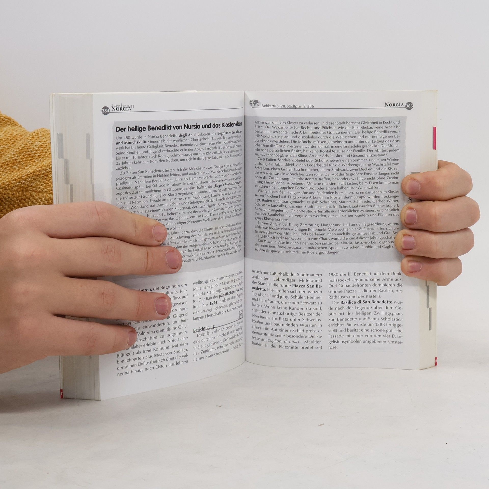- Geschichte, Kunst und Religion: Detaillierte Beschreibungen der berühmten Städte, Kirchen und Kunstwerke Umbriens. - Natur und Landschaft: Entdeckungstouren durch einsame Bergwälder und zu abgelegenen Dörfern und Einsiedeleien im umbrisch-märkischen Apennin. - Umbrien praktisch: umfangreiche Informationen zu Hotels, Ferien auf dem Lande, Camping, Restaurants, öffentlichen Verkehrsmitteln, Badestränden, sportlichen Unternehmungen, Einkaufsmöglichkeiten und Festen. - Umbrien kulinarisch: Trüffel, Linsen und Strangozzi. Italienische Esskultur abseits von Spaghetti und Pizza. - Umbrien zu Fuß: Wandervorschläge mit detaillierten Wegbeschreibungen einschließlich Mehrtagesroute zu den Sibillinischen Bergen. - Unbekanntes Mittelitalien: Streifzüge durch die angrenzenden Marken und das nördliche Latium mit dem Bolsenasee. 262 Seiten Umbrien, 168 Seiten Marken Pressestimmen Merian, Umbrien und die Marken, 04/2003: „Alle Sehenswürdigkeiten ausführlich, leicht und einladend beschrieben. Informative, kritische Themenkapitel.“ Salzburger Woche v. 10.04.03 „Einen besseren Reiseführer für diese Region gibt es derzeit nicht.“ Eggert, Internetdienst v. 28.04.03 ". Ist dieses mit vielen Tiüüs und Informationen gespickte Handbuch derzeit wohl der umfangreichste und aktuellste Reiseführer für die beiden Regionen im 'grünen Herzen Italiens'."