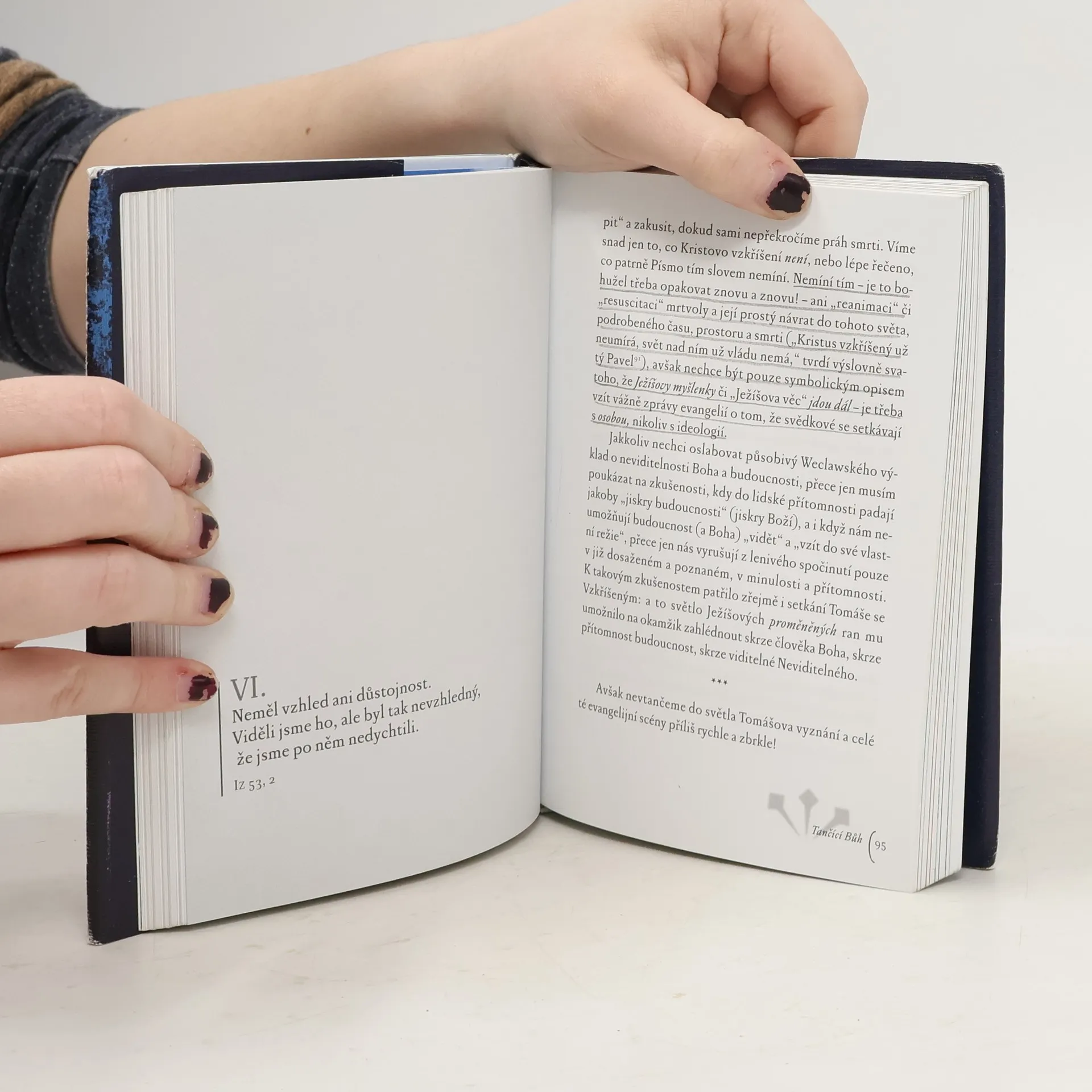 Ve čtrnácti esejích autor vychází z evangelijního příběhu o „nevěřícím Tomášovi". Představy o Bohu, církvi a víře „bez zranění" autor považuje za iluze. Ke křesťanské víře patří odvaha vidět rány našeho světa a dotýkat se jich vírou, která sama je jimi zasažena, zraněna. Tváří v tvář „zraněnému Bohu" člověk může odložit „brnění, masky a šminky", jimiž před druhými a někdy sám před sebou zakrývá svá bolestná místa. Kniha obsahuje jak teologicko-filozofické meditace, dotýkající se mystických hloubek víry, tak překvapivé, ostré i místy humorné komentáře konkrétních událostí a typických znaků naší doby. Zdrojem autorovy inspirace je křesťanská i židovská mystika, Pavlova a Lutherova teologie kříže, současná postmoderní filozofie a teologie i poklady staré lidové velikonoční zbožnosti a umění a v neposlední řadě i autorovy vlastní zkušenosti z dlouholeté terapeutické i pastorační praxe.
