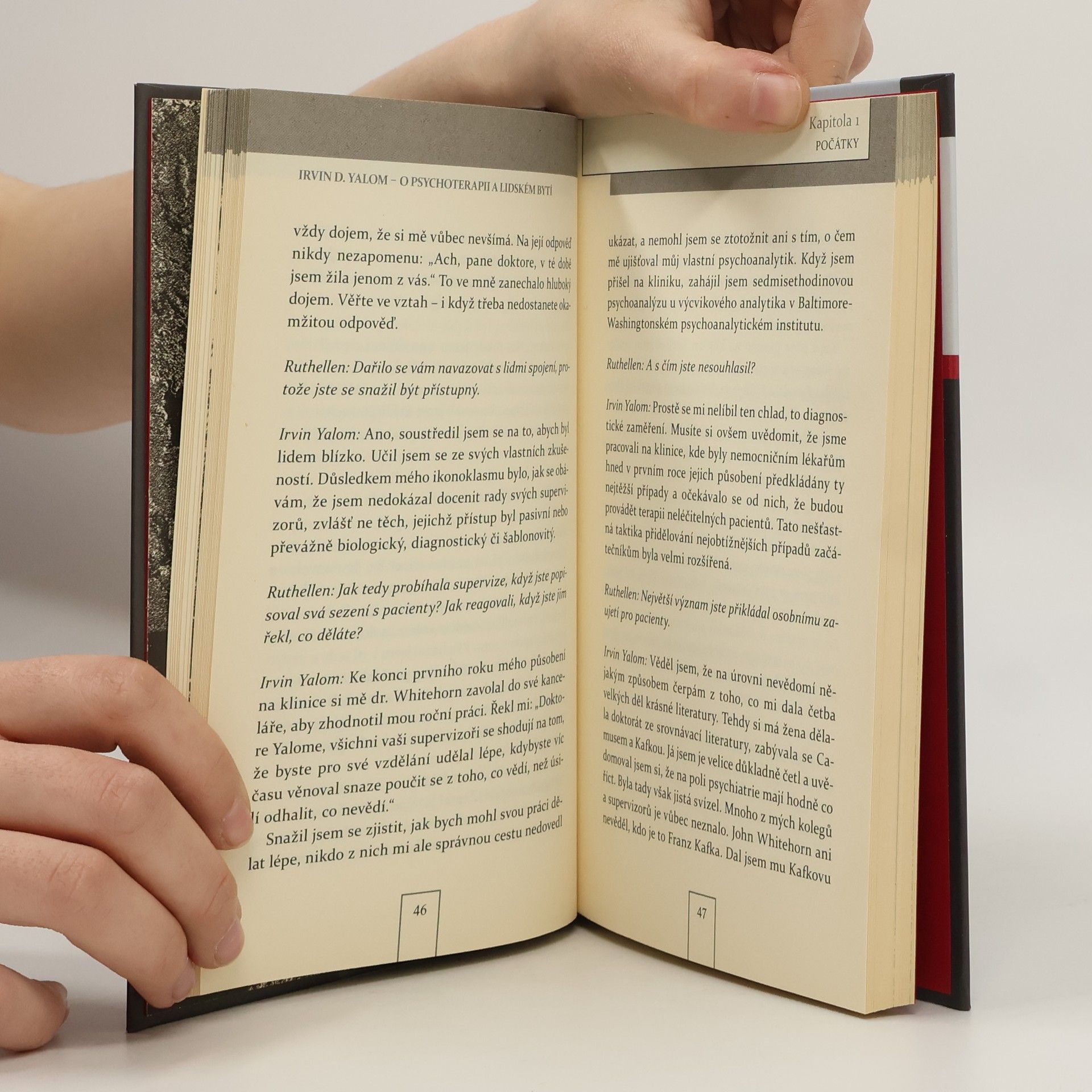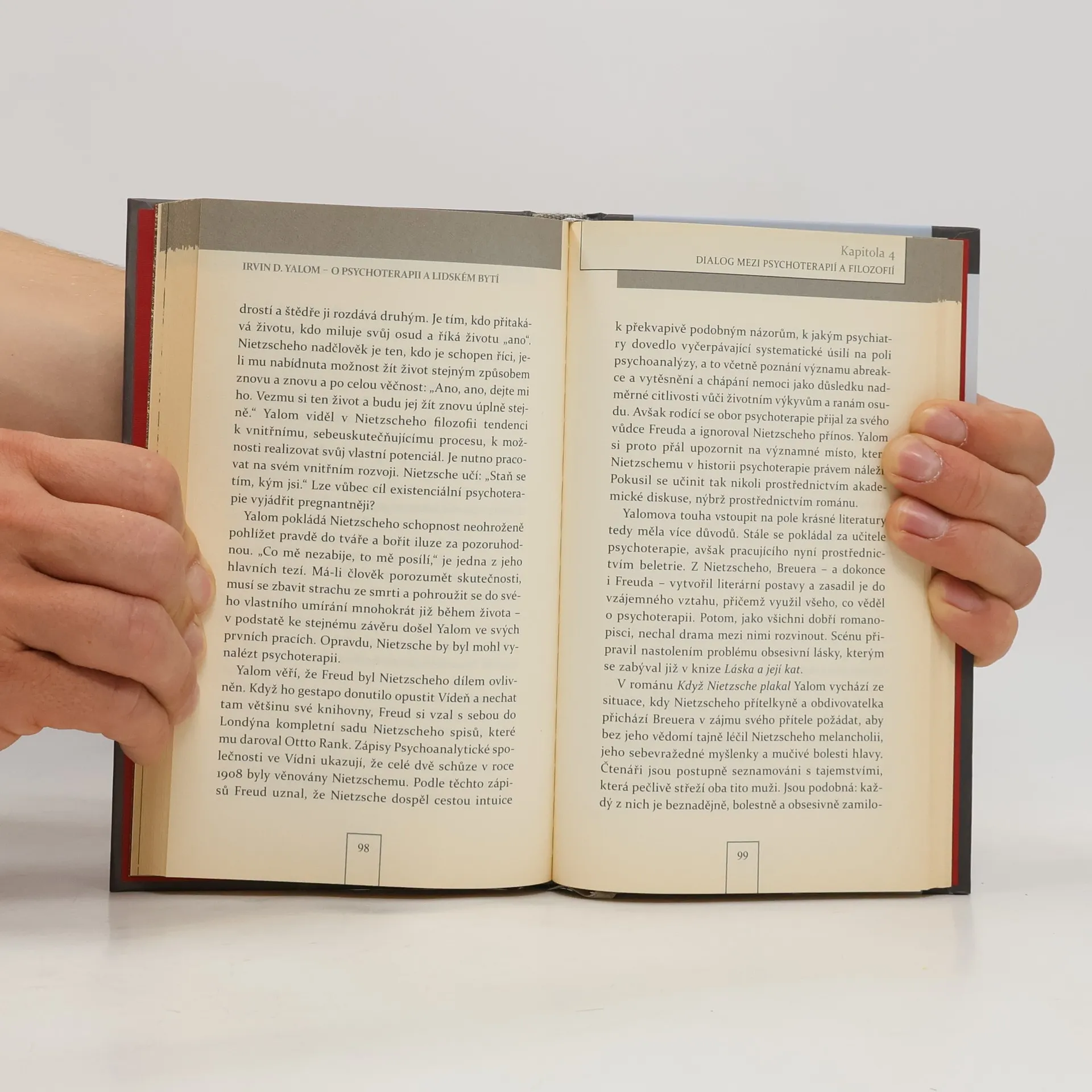 Kniha je pojata jako rozhovor s I. D. Yalomem a současně stručný úvod do jeho díla. Rozhovor na začátku a konci knihy popisuje cestu I. D. Yaloma k psychiatrii, jeho akcenty v chápání lidského bytí, psychiky a přístupu k psychickému utrpení člověka. Představuje také I. D. Yaloma jako spisovatele, který k psaní existenciálních příběhů tíhl od počátků své profesionální dráhy. Na pozadí Yalomových děl a citací z nich se autorka zabývá jeho chápáním dilemat lidské existence, psychoterapeutického procesu, vztahu mezi psychoterapií a filozofií a možnostmi psychoterapie vůbec.