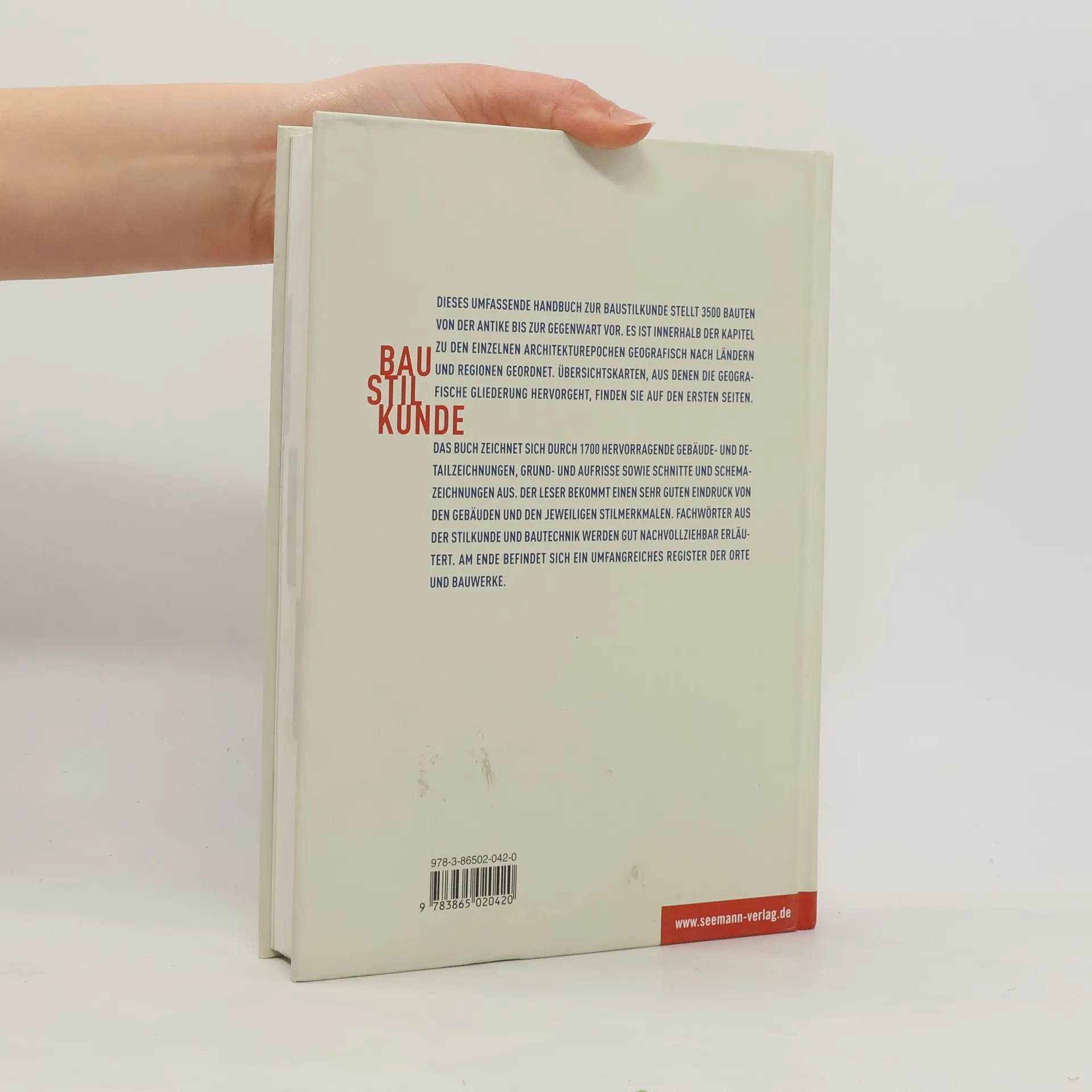 Dieses umfassende Handbuch zur Baustilkunde stellt 3500 Bauten von der Antike bis zur Gegenwart vor. Es ist innerhalb der Kapitel zu den einzelnen Architekturepochen geografisch nach Ländern und Regionen geordnet. Übersichtskarten, aus denen die geografische Gliederung hervorgeht, finden Sie auf den ersten Seiten. Das Buch zeichnet sich durch 1700 hervorragende Gebäude- und Detailzeichnungen, Grund- und Aufrisse sowie Schnitte und Schemazeichnungen aus. Der Leser bekommt einen sehr guten Eindruck von den Gebäuden und den jeweiligen Stilmerkmalen. Fachwörter aus der Stilkunde und Bautechnik werden gut nachvollziehbar erläutert. Am Ende befindet sich ein umfangreiches Register der Orte und Bauwerke.