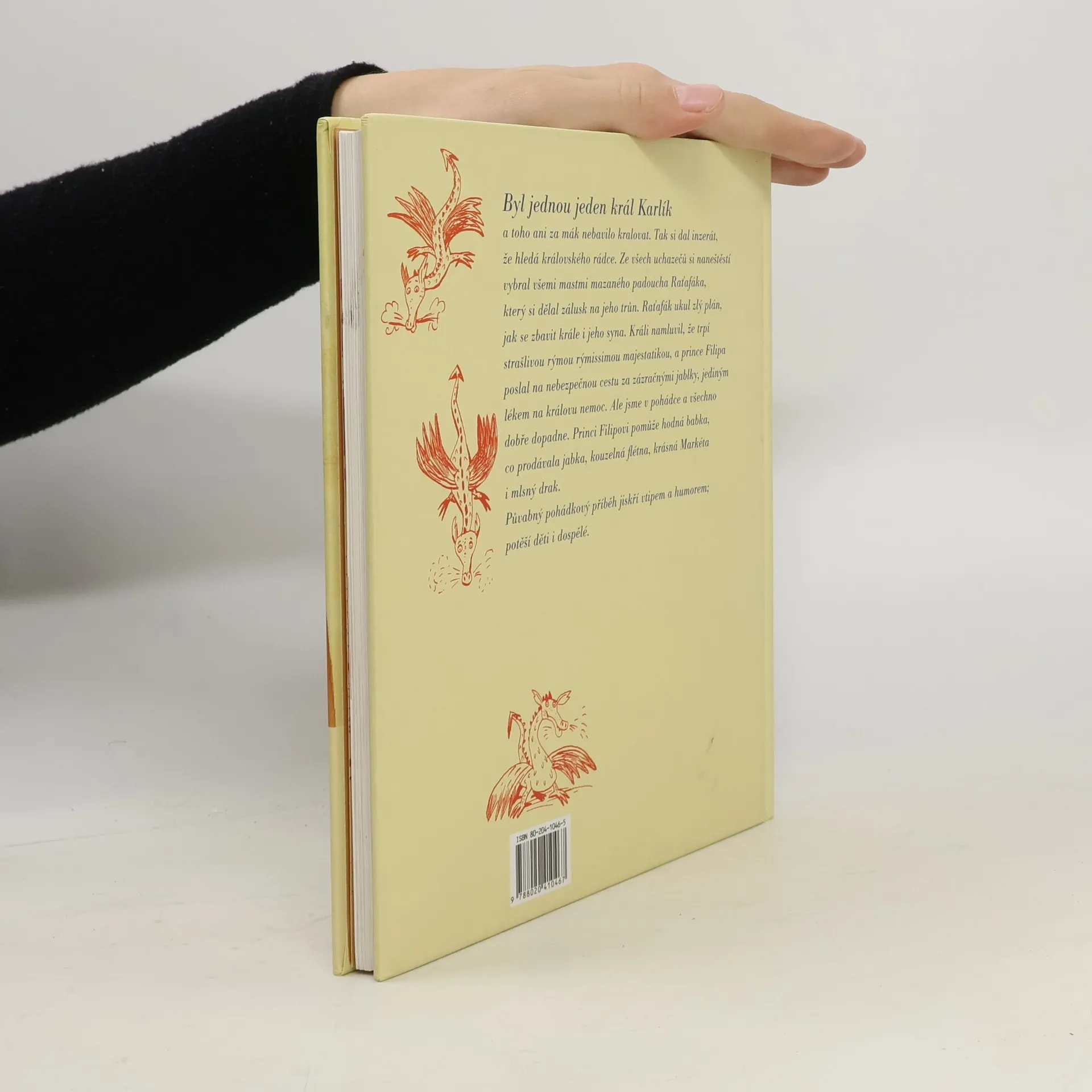 Pohádkový příběh o králi Karlíkovi a jeho novém rádci, všemi mastmi mazaném Raťafákovi, který chce získat královský trůn pro sebe. Pohádka pro mladší děti. V krátkých kapitolách se postupně seznámíme s králem Karlíkem, který raději chodí s pořádnou svačinou na ryby, než vládne, s jeho synem, bystrým princem Filipem, ale především s padouchem Raťafákem a jeho pomocníkem dlouhánem Fistulí, kteří tajně kují pikle na svržení krále Karlíka. V cestě jim však stojí chytrý princ, toho je třeba se lstí zbavit. Jestli se Filipovi podaří království zachránit, to se dozvíme na stránkách veselé pohádky o jablkách plných vitamínů a sluníčka, a nejen o nich. Vyprávění je doplněno pěknými ilustracemi E. Sýkorové-Pekárkové.... celý text