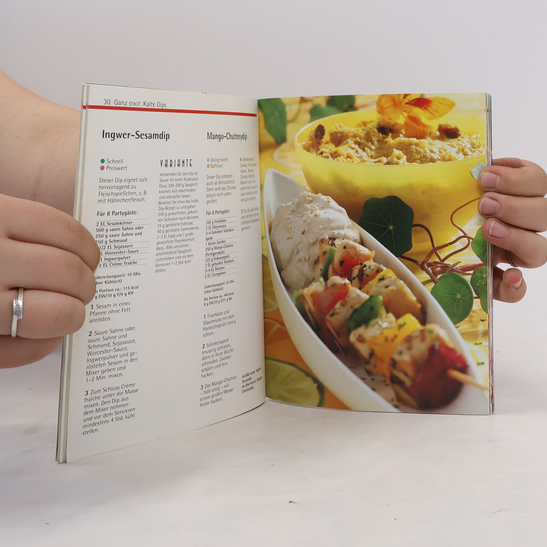 Total hip der Dip und der Tip aus den USA. Keine Party mehr ohne Stippen: Man leckt sich die Lippen beim Dippen. Warm oder kalt, suess oder sauer, cremig oder stueckig - sie sind der Mega-Hit aus der amerikanischen Kueche und derzeit Kult fuer Party-People, kleine Snacker und USA-Fans. Schnell gezaubert, fuer Gaeste gut vorzubereiten von der Vorspeise bis zum Dessert, unkompliziertes Fingerfood ist in. Und wer ganz auf den Abwasch verzichten moechte, serviert den Dip stilgerecht in ausgehoehlten Broten oder Paprikahaelften.