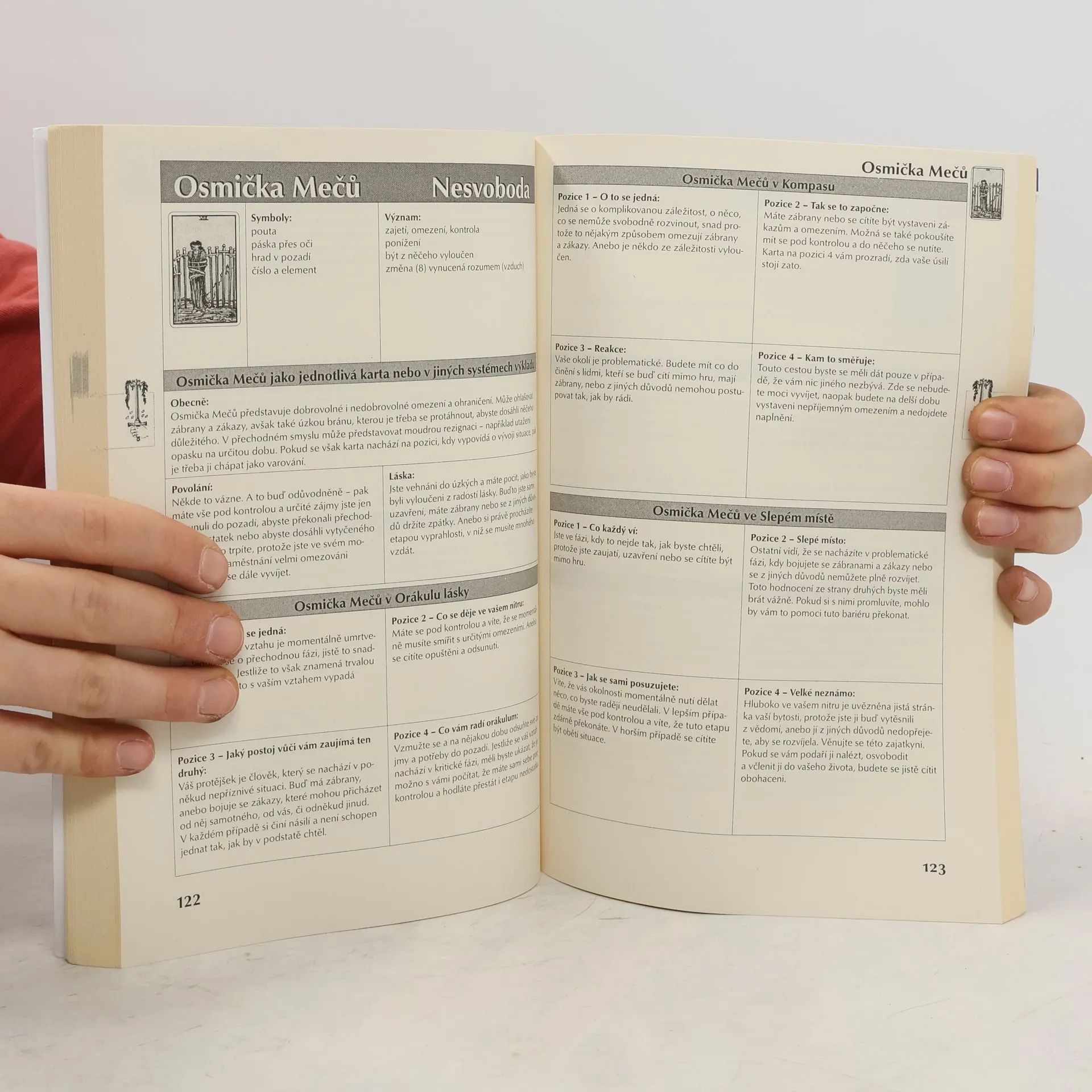 Mezi množstvím existujících knih o tarotu je tato unikátní, protože podává přesný výklad jednotlivých karet v závislosti na typu výkladu, jaký právě potřebujete. Zároveň dostáváte návod na několik základních typů výkladu. (s interpretacemi ke všem kartám v různých pozicích výkladu Kompas - Orákulum lásky - Slepé místo)