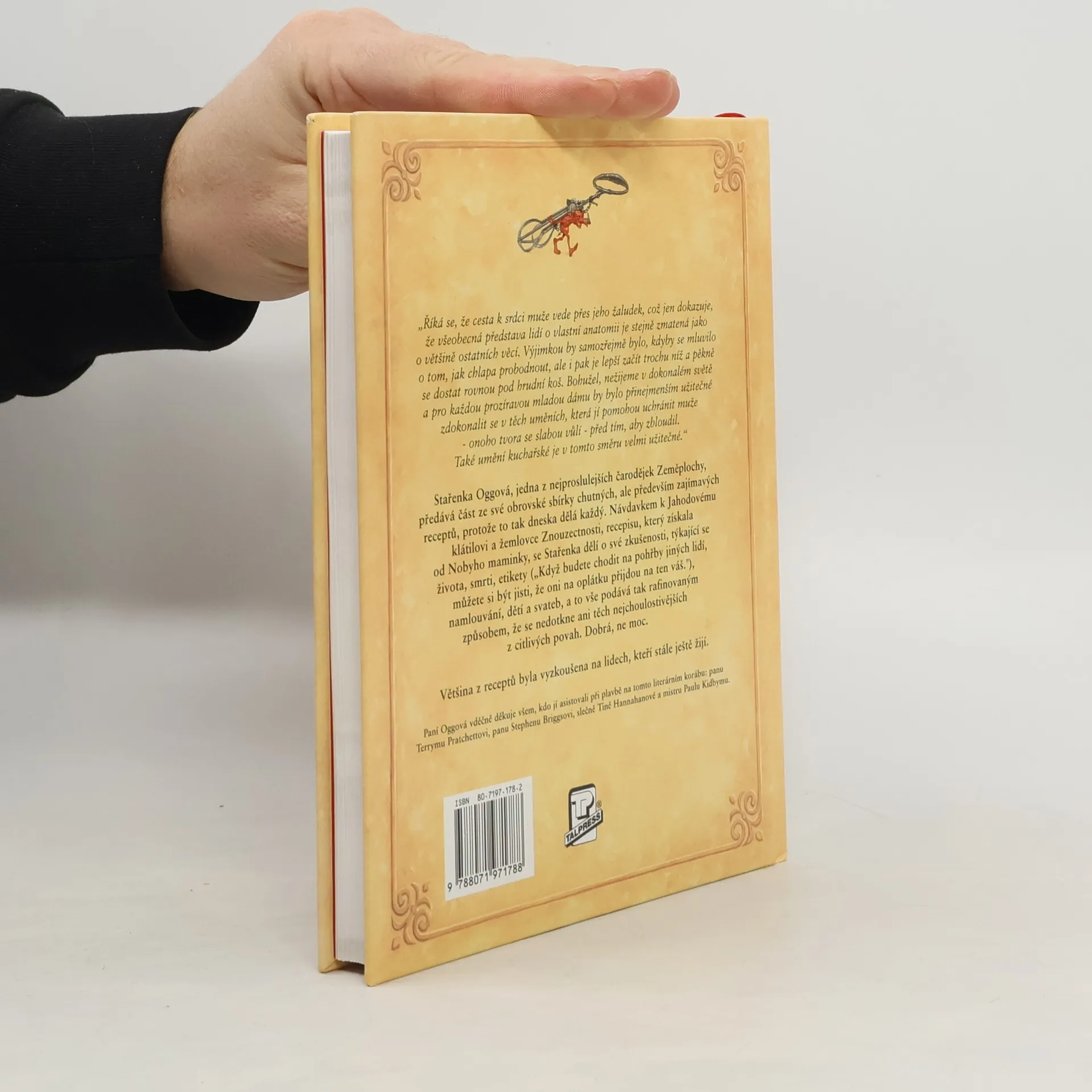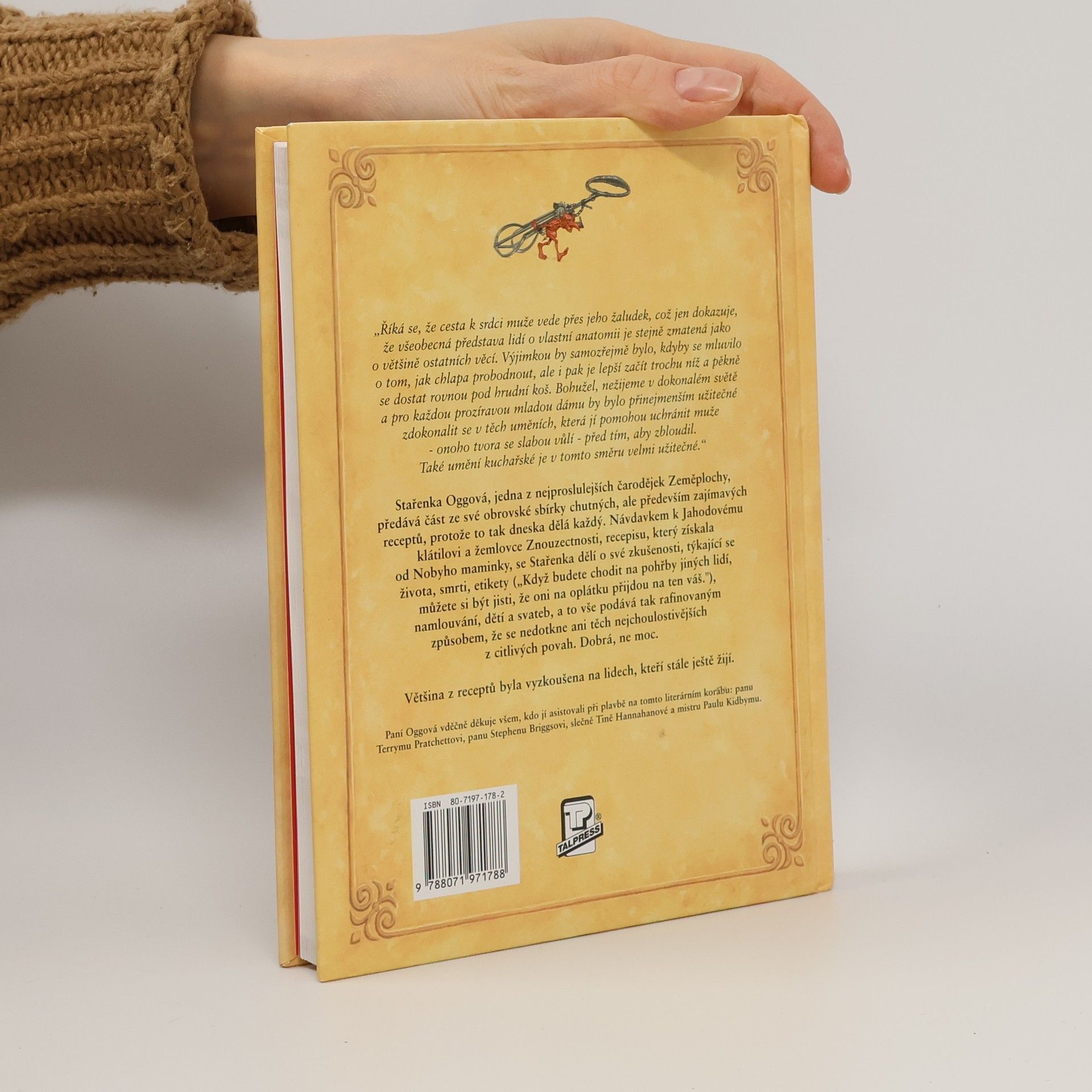 Stařenka Oggová, jedna z nejproslulejších čarodějek Zeměplochy, předává část ze své obrovské sbírky chutných, ale především zajímavých receptů, protože to tak dneska dělá každý. Návdavkem k Jahodovému klátilovi a žemlovce Znouzecnosti, recepisu, který získala od Nobyho maminky, se Stařenka dělí o své zkušenosti, týkající se života, smrti, etikety („Když budete chodit na pohřby jiných lidí, můžete si být jisti, že oni na oplátku přijdou na ten váš.“), namlouvání, dětí a svateb, a to vše podává tak rafinovaným způsobem, že se nedotkne ani těch nejchoulostivějších z citlivých povah. Dobrá, ne moc. Většina z receptů byla vyzkoušena na lidech, kteří stále ještě žijí! Paní Oggová děkuje všem, kdo jí asistovali při plavbě na tomto literárním korábu: panu Terrymu Pratchetovi, panu Stephenu Briggisovi, slečně Tině Hannahanové a mistru Paulu Kidbymu. Kniha ze série Úžasná Zeměplocha, přeložil Jan Kantůrek.