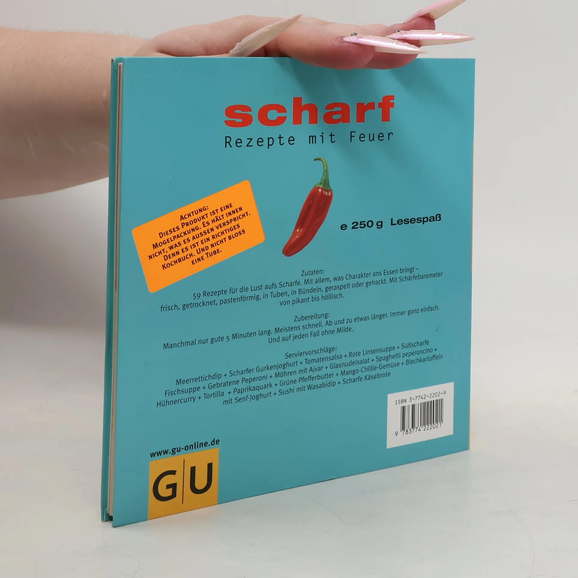 Manche moegen es scharf. Und das sind immer mehr. Nicht fad, nicht langweilig, sondern mit Pfiff, Aroma und Charakter. Pikant und feurig sind die neuen Rezepte von Cornelia Schinharl. Mit frechen Texten, Tipps und Animationen garniert, ueberleben sie im wasserfesten Einband auch die Loescharbeiten in der Chaotenkueche. Unkonventionelle Foodfots, Steckbriefe der Scharfmacher, Fundquellen vom Asienshop bis zum Gemuesehaendler, Sicherheitsverwahrung fuer die scharfen Sachen - alles drin in der Theorie. Und im Rezeptteil: Scharfes fuer viel Zeit oder wenig, und Scharfes fuer die grosse Runde.