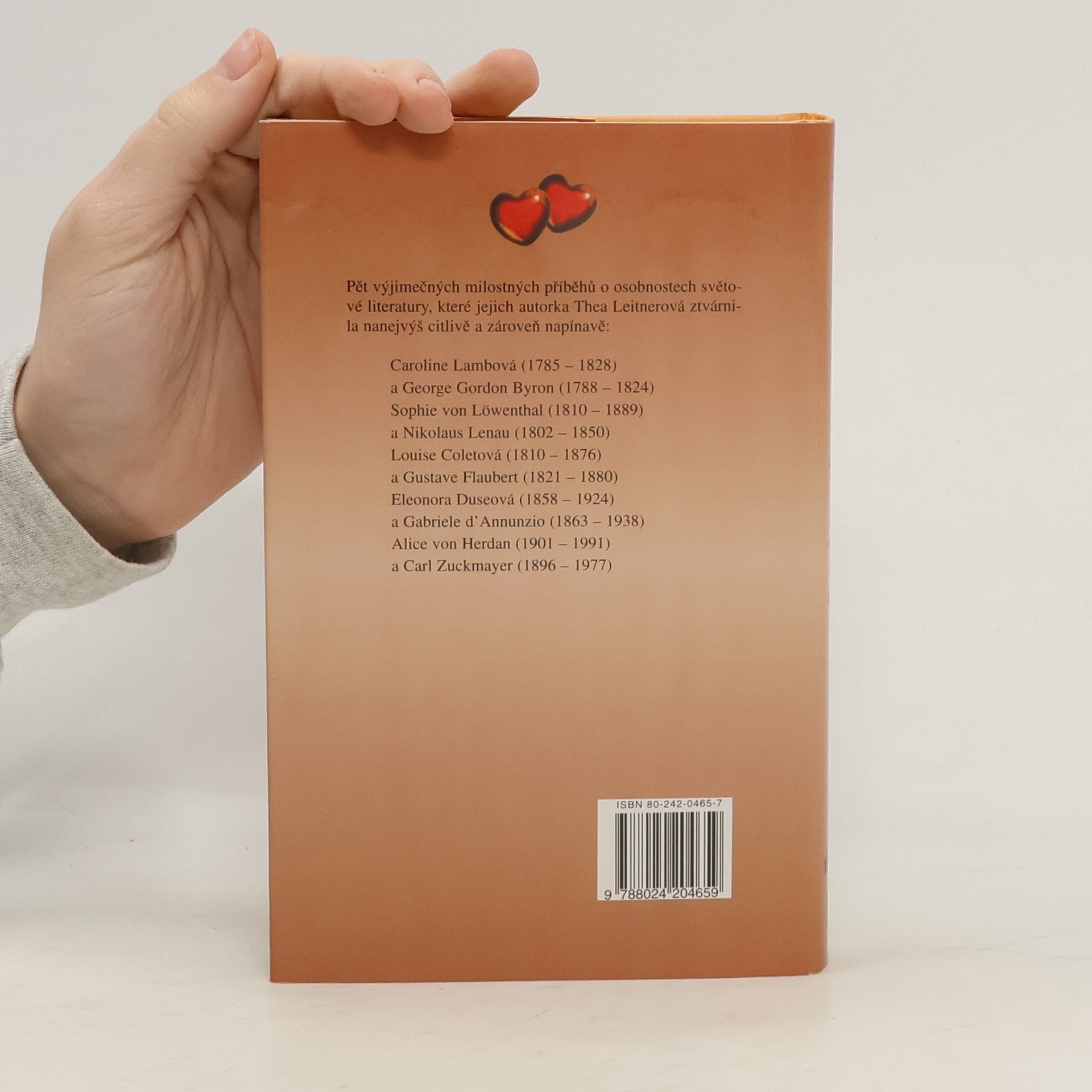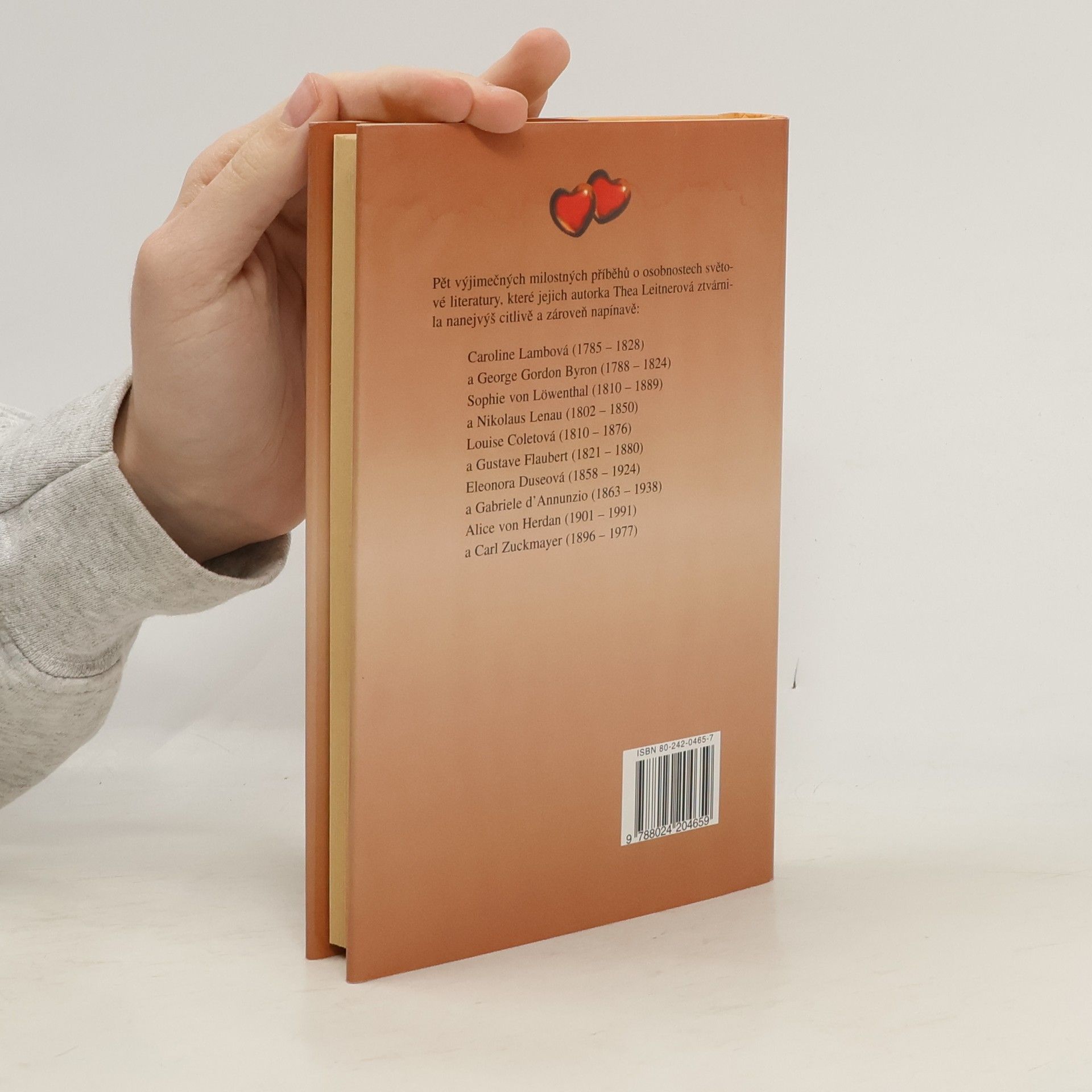 Milostné vztahy pěti významných osobností evropské literatury: Byrona, Lenaua, Flauberta, D'Annunzia, Zuckmayera. Autorka se zabývá jedním z nejhlubších lidských citů, jakým je fenomén lásky, a to na osudech pěti prominentních dvojic evropského literárního světa od konce 18. do 20. století. Zkoumá osudové milostné příběhy z pohledu inspirace pro jejich literární tvorbu. Jak ony osudové ženy motivovaly životní vzlety i pády proslulých mužů pera. Jaké byly skutečné kořeny Byronova individualismu. Co rozehrála Sophie von Löwenthal svou odmítavostí ve vztahu k Lenauovi, čím byla Louise Coletová pro Flauberta vedle jeho matky. Co formovalo vztah D'Annunzia a herečky Eleonory Duseové v kontextu jeho tvorby. Jaké společenské pozadí a vztahy se nesou dílem rakouského dramatika Carla Zuckmayera, do jakých rolí uvrhla emigrace do USA tento spisovatelský pár.