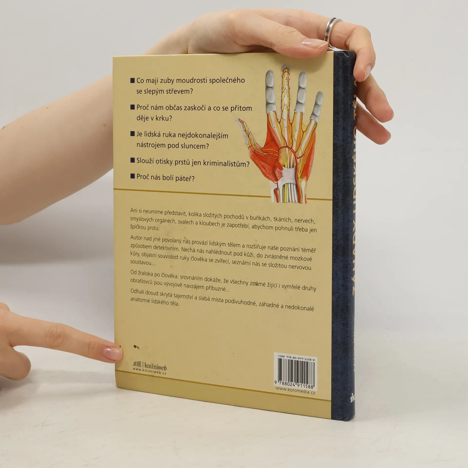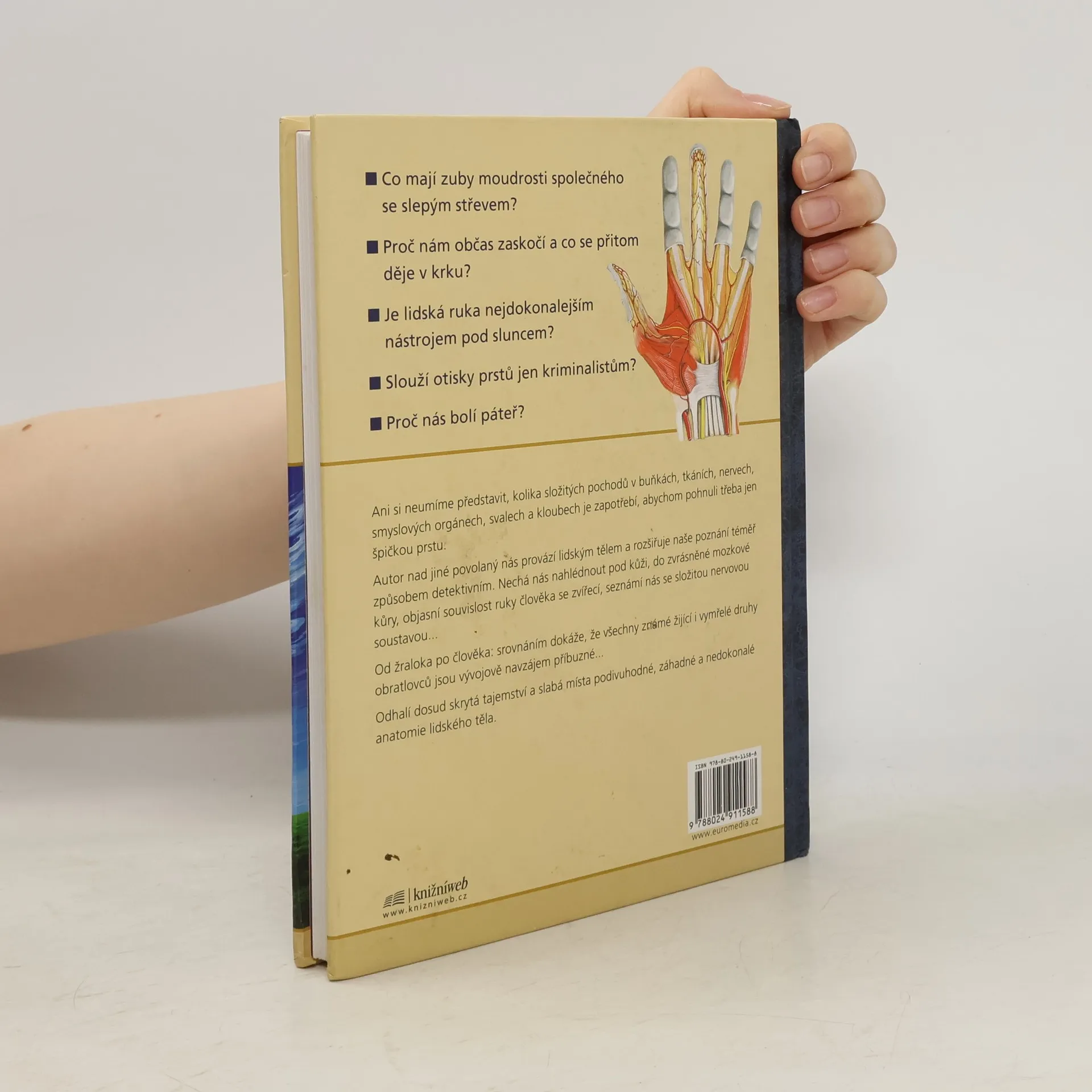 Proč nám občas zaskočí a co se přitom děje v krku? Co mají zuby moudrosti společného se slepým střevem? Je lidská ruka nejdokonalejším nástrojem pod sluncem? Slouží otisky prstů jen kriminalistům? Proč nás bolí páteř? Ani si neumíme představit, kolika složitých pochodů v buňkách, tkáních, nervech, smyslových orgánech, svalech a kloubech je zapotřebí, abychom pohnuli třeba jen špičkou prstu. Autor nad jiné povolaný nás provází lidským tělem a rozšiřuje naše poznání téměř způsobem detektivním. Nechá nás nahlédnout pod kůži, do zvrásněné mozkové kůry, objasní souvislost ruky člověka se zvířecí, seznámí nás se složitou nervovou soustavou… Od žraloka po člověka: srovnáním dokáže, že jsou všechny známé žijící i vymřelé druhy obratlovců vývojově navzájem příbuzné… Odhalí dosud skrytá tajemství a slabá místa podivuhodné, záhadné a nedokonalé anatomie lidského těla.