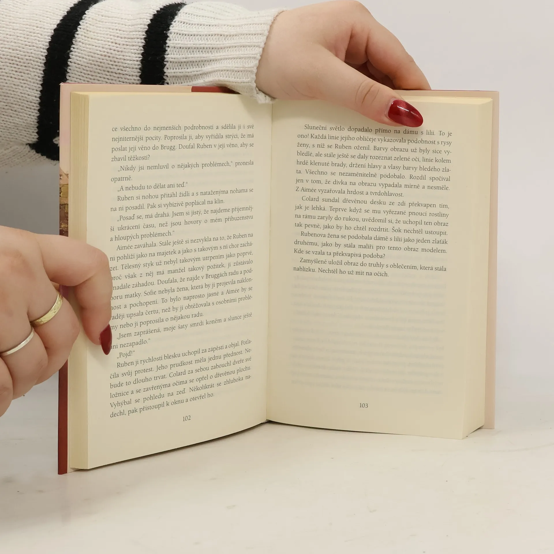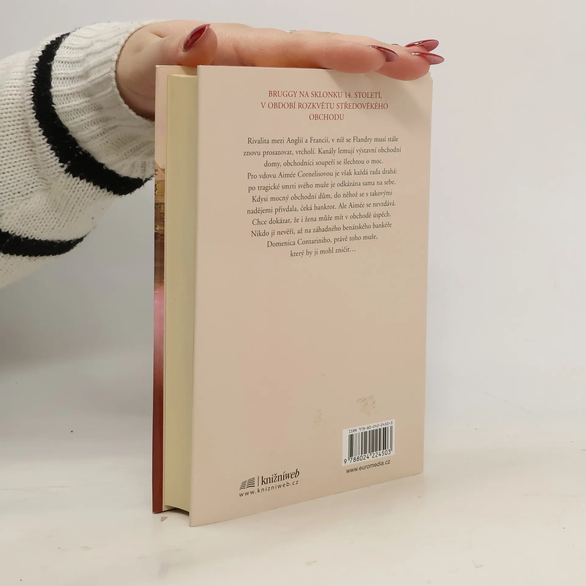 Na svatbě Filipa Smělého s Markétou Flanderskou v roce 1369 se mladá šlechtična Aimée Andrieu seznámí se šarmantním Rubenem Cornelisem, dědicem jednoho z největších obchodních domů v Bruggách. Flandry jsou zemí významných obchodníků, a tak se na jejich brzký sňatek nehledí jako na stavovsky nepřiměřený. Avšak s domem Corneliových to nevypadá nejlépe. Aby zachránil, co sedá, vydá se Ruben na obchodní cestu a při lodním neštěstí zemře. Brzy se rozkřikne, že obchodní dům stojí před krachem. Významní věřitelé, mezi nimi i mladý benátský bankéř Domenico Contarini požadují vrácení svých peněz. Co dělat? Obzvláště Aiméein švagr Colard radí k rozumnému jednání a k prodeji a potají si dělá naděje, že krásnou vdovu získá. Avšak Aimée má v úmyslu něco jiného: Jako bývalá dvorní dáma zná slabost vévodkyně Markéty pro šperky, drahá roucha a působivé koberce. S ní bude moci obchodovat. Aimée odjede do Dijonu a ohromí všechny svou činorodostí. Dokáže dokonce uhradit část dluhu u Conariniho. Co však vlastně vede Benátčana k tomu, aby jí šel na ruku? Colard před ním nepřestává Aimée varovat, cítí však, že mu zde roste silný konkurent…