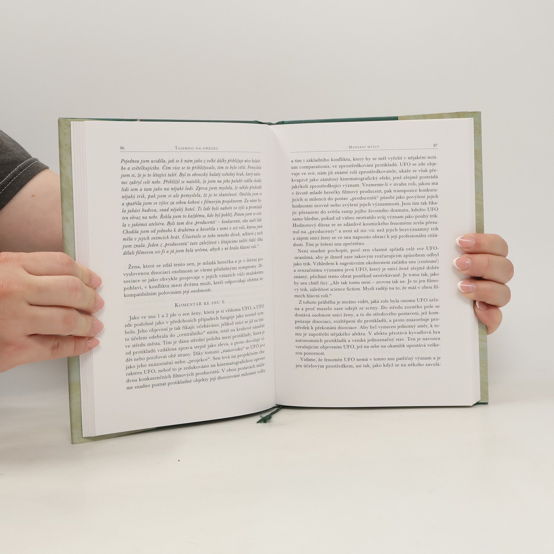 Základem knihy je slavná Jungova práce "Moderní mýtus. O věcech, které jsou vídány na nebi" z roku 1958 (UFO jako pověst, UFO ve snech, UFO v malířství ...). Další část tvoří Jungova vybraná korespondence s tematikou UFO. Jung se fenoménu UFO věnoval řadu let: při svých zkoumáních nezjišťoval pravost či falešnost zpráv o létajících talířích, ale snažil se pochopit jejich psychologický a mytický význam, jejich kolektivní smysl a současně postihnout hlavní problémy planetárního lidstva naší epochy - prohlubující se rozštěpení homosféry, s tím vzrůstající potřebu celosti a sjednocení, nové požadavky na růst vědomí a zohlednění étosu a mravnosti... Objevil přitom řadu paralelních obrazů a úkazů v mytologii a historických zprávách a došel k závěru, že UFO představují symboly bytostného Já. Součástí knihy je řada černobílých ilustrací, barevná obrazová příloha a bibliografie.