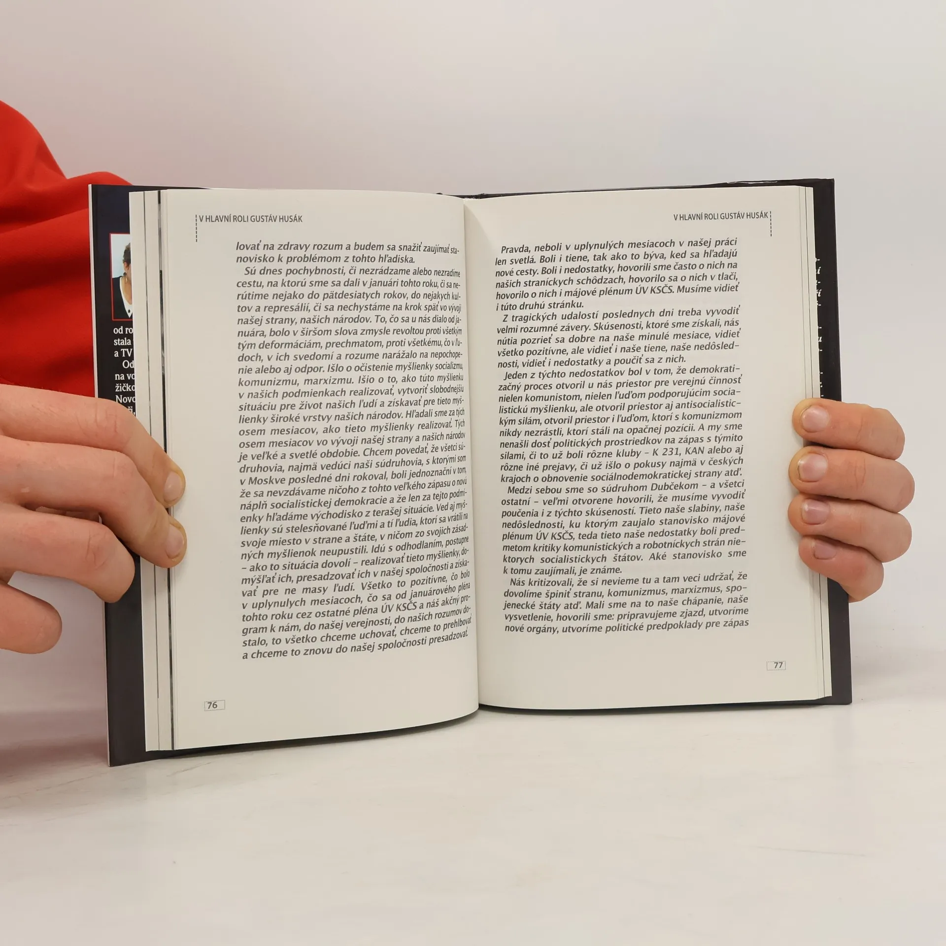 Skoro se nechce věřit, že o muži, který vládl této zemi z pozice nejvyššího stranického představitele a později i z pozice prezidenta republiky skoro dvecet let, nevyšla v České republice žádná monografie. Kniha "V hlavní roli Gustáv Husák" vychází z neobyčejně zajímavého dvouhodinového televizního dokumentu autorů Roberta Sedláčka a Michala Kubala a není v pravém slova smyslu jen politicko-historickou reminiscencí Husákovy osobnosti, ale spíše psychologickým portrétem muže, který to zpočátku možná myslel dobře, ale nakonec se stal tragickou postavou normalizačního období. Cesta od mladého a vzdělaného slovenského intelektuála ke stranickému dogmatikovi, který zcela podléhal Moskvě i jejím pražským přisluhovačům, je někdy až nepochopitelná. v knize vzpomíná na Gustáva Husáka i jeho osobní život celá plejáda osobností politického i kulturního života, počínaje Štrougalem, přes Gorbačova až po jeho přátele ze slovenských uměleckých kruhů.
