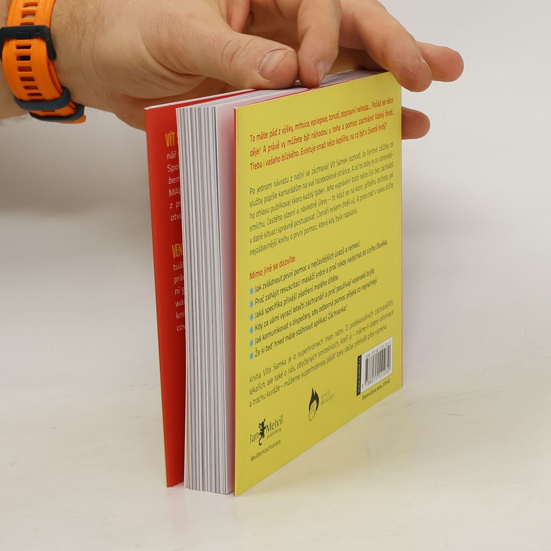 To máte: pád z výšky, mrtvice, epilepsie, tonutí, dopravní nehoda... Pořád se něco děje! A právě vy můžete být náhodou u toho a pomoci zachránit lidský život. Třeba i vašeho blízkého. Existuje snad něco lepšího, na co být v životě hrdý? Po jednom návratu z noční se záchranář Vít Samek rozhodl, že čerstvé zážitky ze služby popíše kamarádům na své facebookové stránce. A od té doby je za obrovského ohlasu publikoval skoro každý týden. Jeho vyprávění totiž nelze číst bez záchvatů smíchu, častého slzení a následné úlevy – to když se na konci příběhu dočtete, jak v dané situaci správně postupovat. Čtenáři ovšem chtěli víc. A proto teď v rukou držíte nejzábavnější knihu o první pomoci, která kdy byla napsána. Mimo jiné se dozvíte Jak zvládnout první pomoc u nejčastějších úrazů a nemocí. Proč zahájit resuscitaci masáží srdce a proč nikdy nedýchat do cizího člověka. Jaká specifika přináší ošetření malého dítěte. Kdy za vámi vyrazí letečtí záchranáři a proč používají vojenské brýle. Jak komunikovat s dispečery, aby odborná pomoc přijela co nejrychleji. Že si teď hned máte stáhnout aplikaci Záchranka! Kniha Víta Samka je o superhrdinech mezi námi. O profesionálních záchranářích, lékařích, ale také o nás, obyčejných smrtelnících, kteří si – máme-li dobré informace a trochu kuráže – můžeme superhrdinský plášť taky občas přehodit přes ramena.