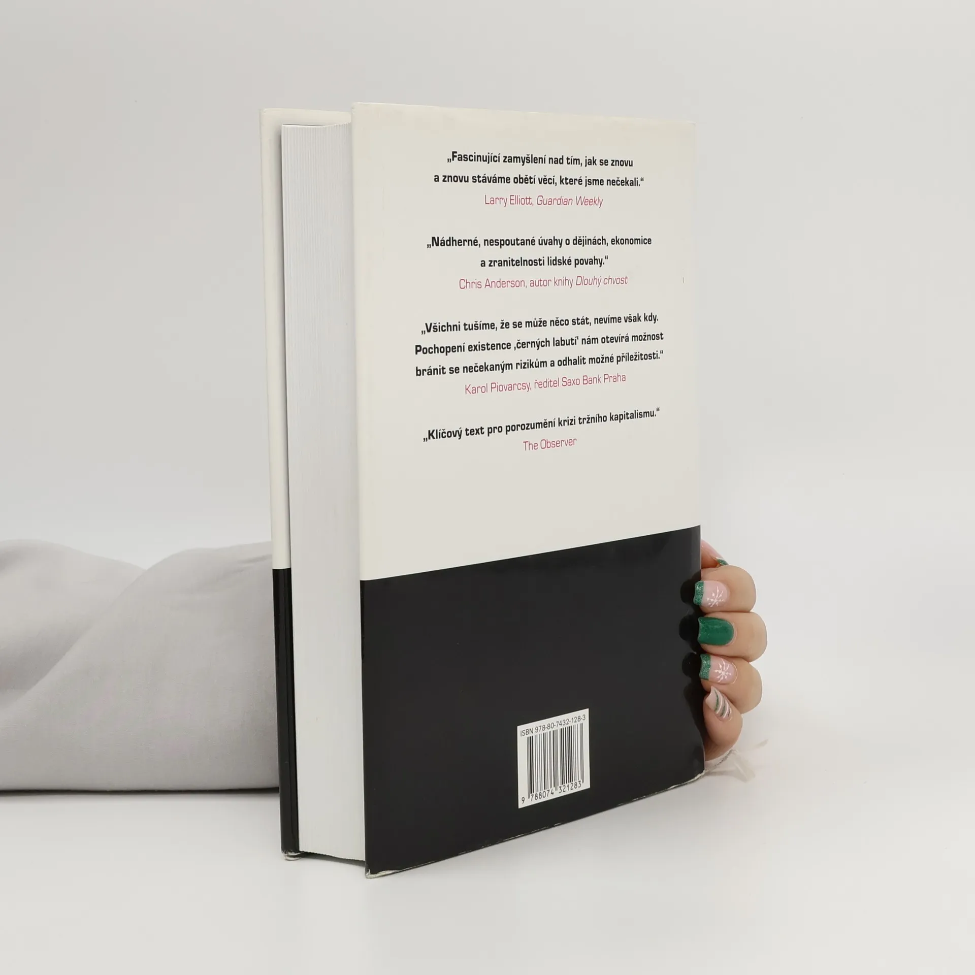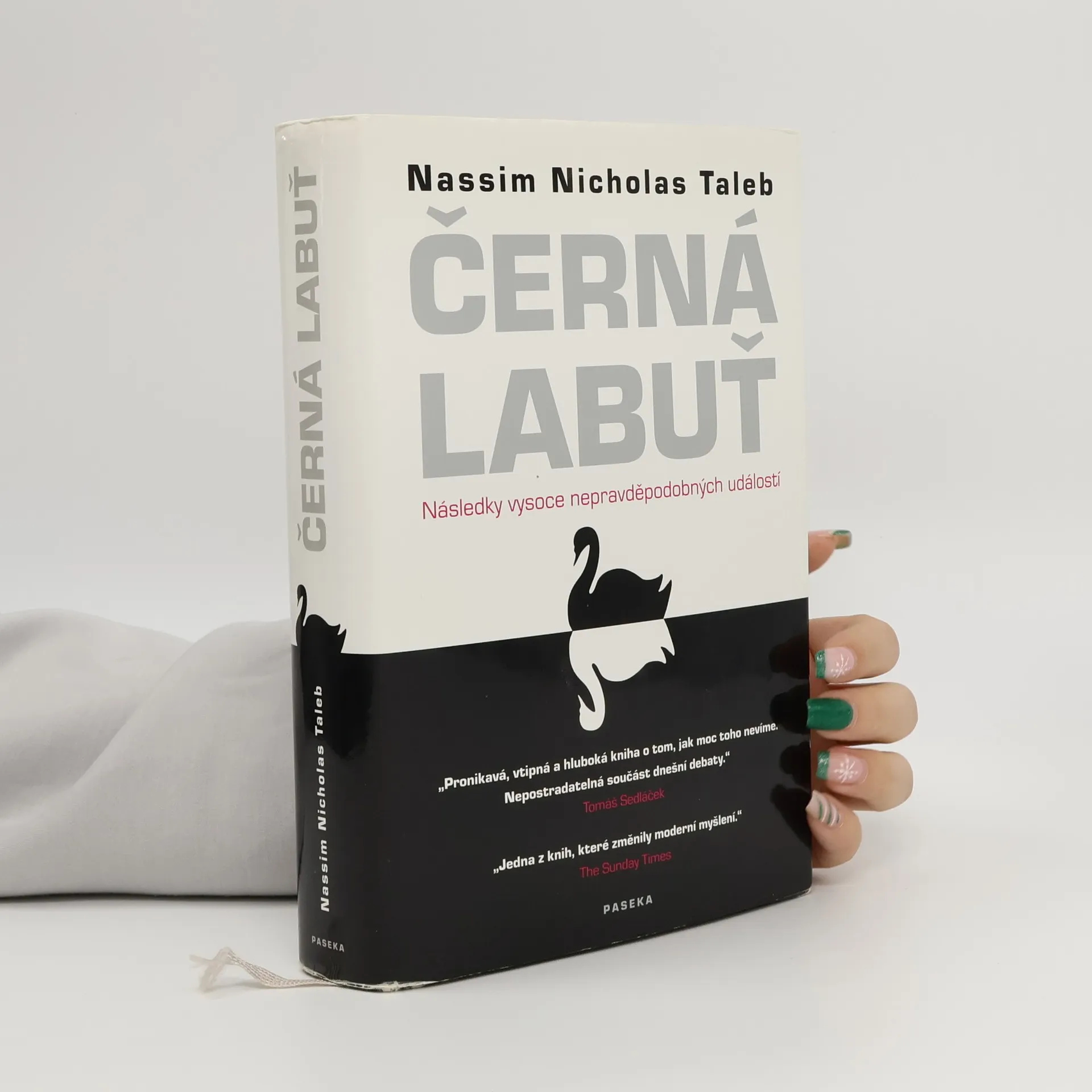 Následky vysoce nepravěpodobných událostí Bestseller amerického akademika a investičního poradce libanonského původu analyzuje fenomén „černých labutí“, tj. nepředvídaných jevů a událostí s významným dopadem na život jedince nebo celé společnosti, jakým byl např. teroristický útok z 11. září 2001, fenomenální úspěch společnosti Google či nedávná globální finanční a ekonomická krize. Autor – jeden z mála odborníků, kteří nástup krize předvídali – věří, že příčinou naší nepřipravenosti na podobné zlomové události je především setrvačnost našeho myšlení v podobě přílišné důvěry ve statistiky a prognostiky, přehnaného kategorizování, hledání „logiky“ vývoje či soustřeďování se na specifika tam, kde bychom měli přemýšlet spíše v obecných kontextech. Jeho kniha, vyzývající k tomu, abychom přehodnotili náš ustálený pohled na svět a přiznali si, jak málo o něm víme, patří dnes k nejdiskutovanějším pracím ve svém žánru, deníkem Times byla označena za jedno z nejvlivnějších děl posledních šedesáti let a díky autorovu širokému rozhledu, smyslu pro humor a zdravé provokativnosti je i velkým čtenářským zážitkem.