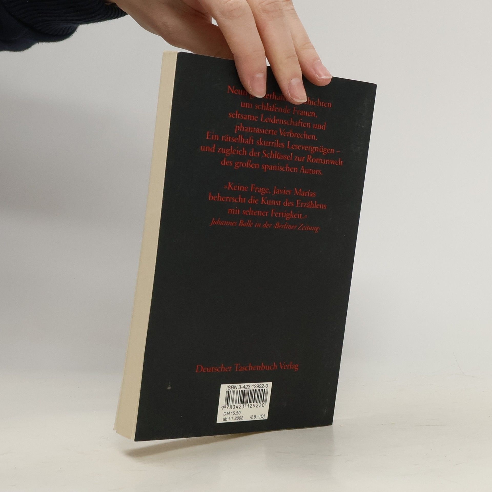 Aus dem Spanischen von Renate Zuniga Eine Urlaubsbekanntschaft auf Mallorca. Ein Pärchen am Strand weckt die Neugierde des Ich-Erzählers: Der Mann hält tagtäglich jede Bewegung der jungen Frau mit einer Videokamera fest. Sie ist von makelloser, sahniger Schönheit, er ist erheblich älter als sie, nicht schön, nicht häßlich, nur dick. In einem nächtlichen Gespräch unter vier Augen offenbart er dem voyeuristischen Ich-Erzähler, was es mit der ständigen Filmerei auf sich hat. Und das zunächst völlig unschuldig scheinende Urlaubsvergnügen wird zunehmend bedrohlicher. Ob die Frauen schlafen, während am nächtlichen Swimmingpool über ihr Leben und ihren Tod verhandelt wird, ob es sich um ein echtes Gespenst aus dem Spanischen Bürgerkrieg handelt, dem ein umtriebiger Engländer auf die Spur zu kommen sucht; ob ein Doppelgänger in Barcelona einen Geschäftsmann in den Ruin treibt oder ob ein junger Mann von der Geliebten seines verstorbenen Vaters Briefe aus dem Jenseits erhält: Der Zwang, sich auf wenige Seiten konzentrieren zu müssen, hat Marías' großartiger Erzählkunst keinen Abbruch getan, ganz im Gegenteil.