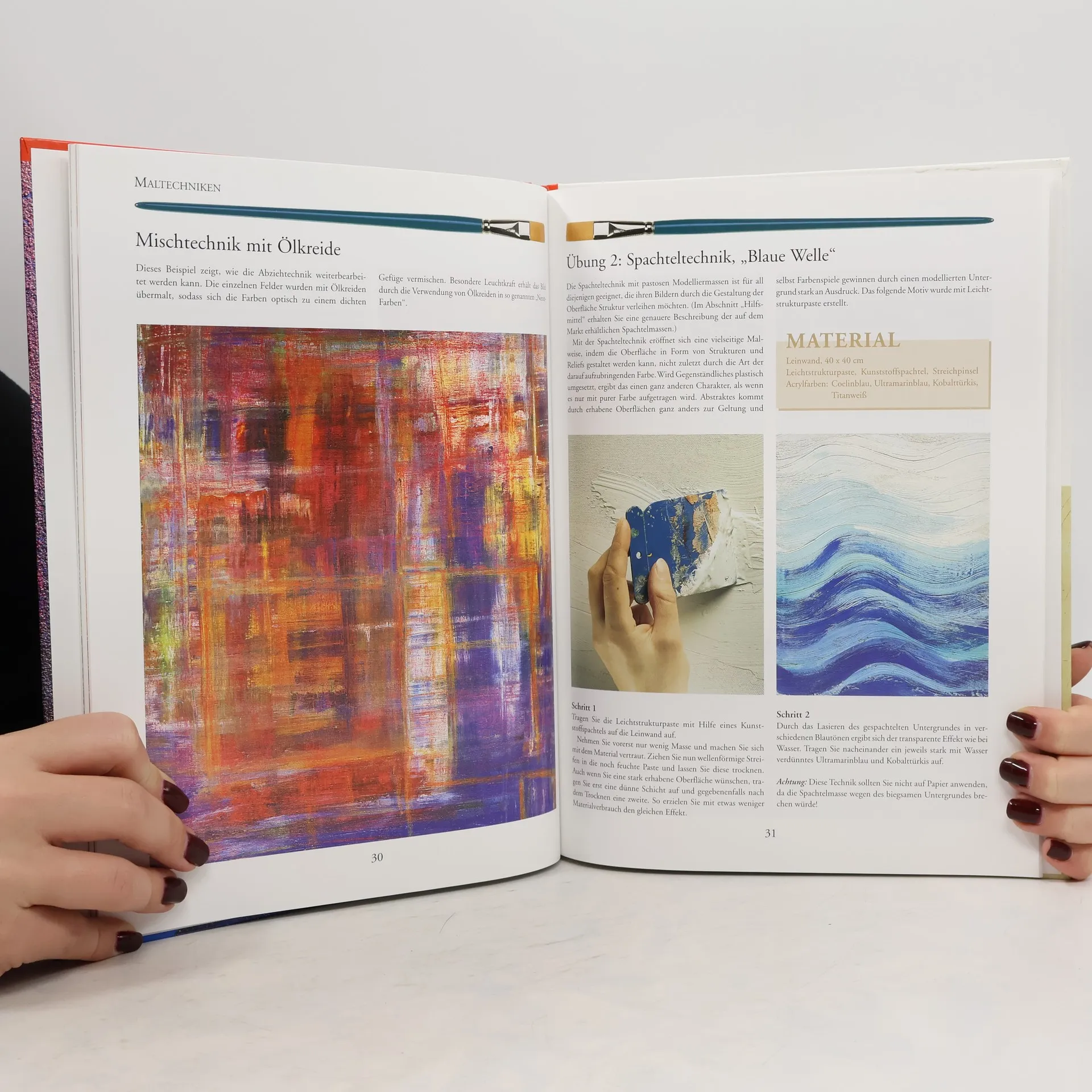 Schritt-für-Schritt-Übungen zeigen, wie man Acrylfarben mit anderen Materialien kombinieren kann, was neue, ungewöhnliche Wirkungen hervorbringt.