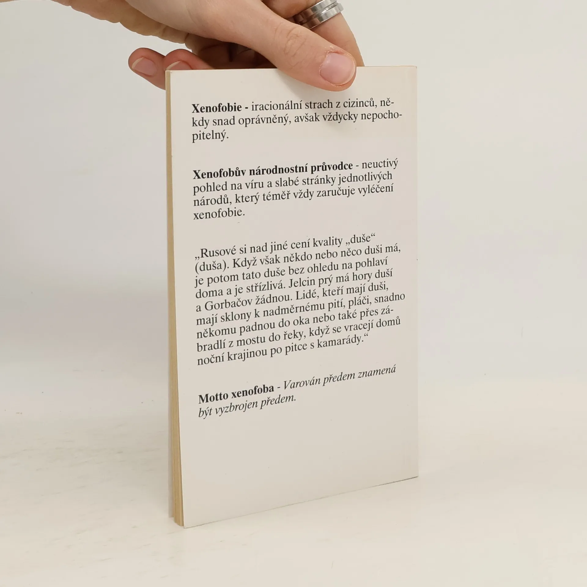 Xenofobie - iracionální strach z cizinců, někdy snad oprávněný, avšak vždycky nepochopitelný. Xenofobův národnostní průvodce - neuctivý pohled na víru a slabé stránky jednotlivých národů, který téměř vždy zaručuje vyléčení xenofobie. „Rusové si nad jiné cení kvality „duše“ (duša). Když však někdo nebo něco duši má, je potom tato duše bez ohledu na pohlaví doma a je střízlivá. Jelcin prý má hory duší a Gorbačov žádnou. Lidé, kteří mají duši, mají sklony k nadměrnému pití, pláči, snadno někomu padnou do oka nebo také přes zábradlí z mostu do řeky, když se vracejí domů noční krajinou po pitce s kamarády.“ Motto xenofoba - Varován předem znamená být vyzbrojen předem. Vydání první... celý text