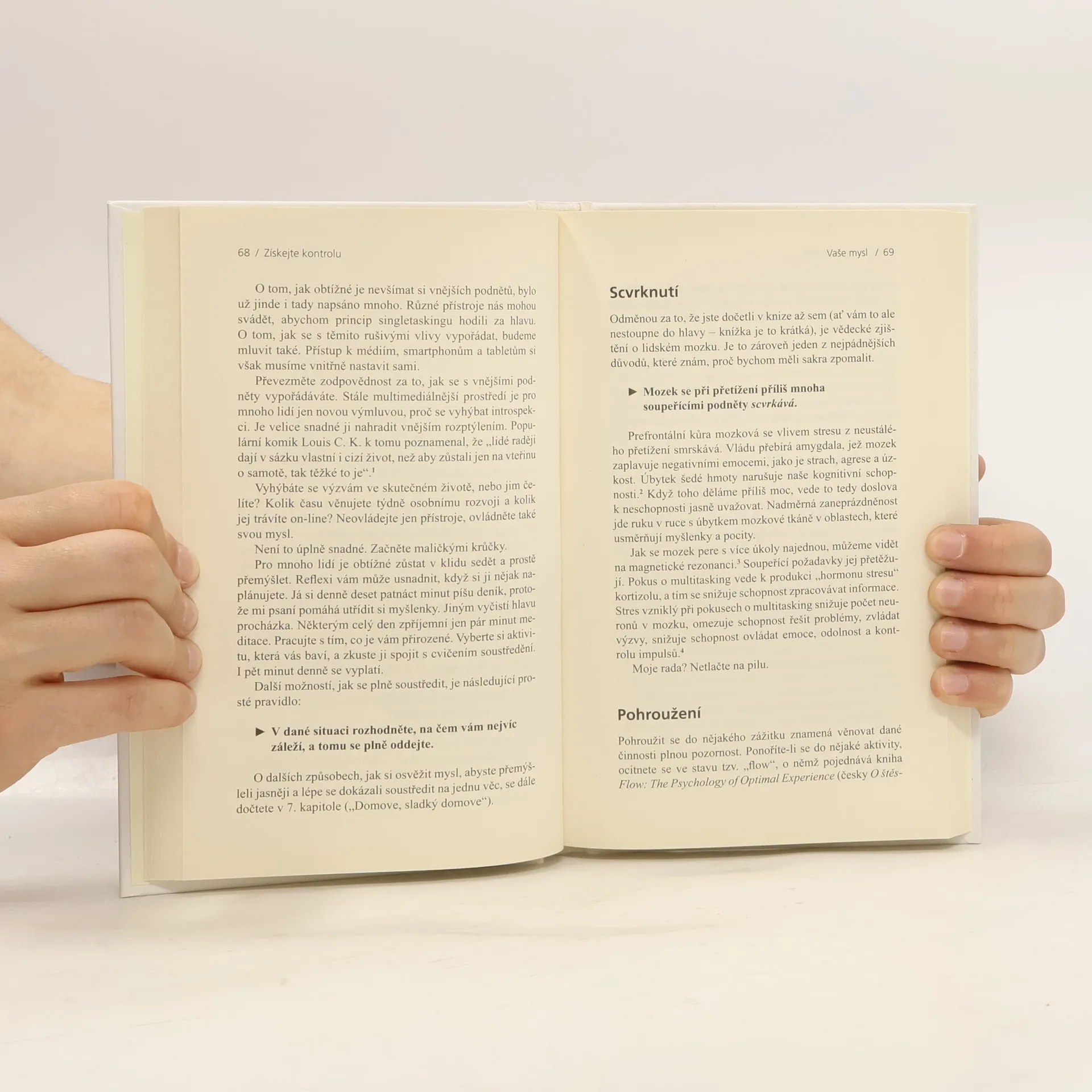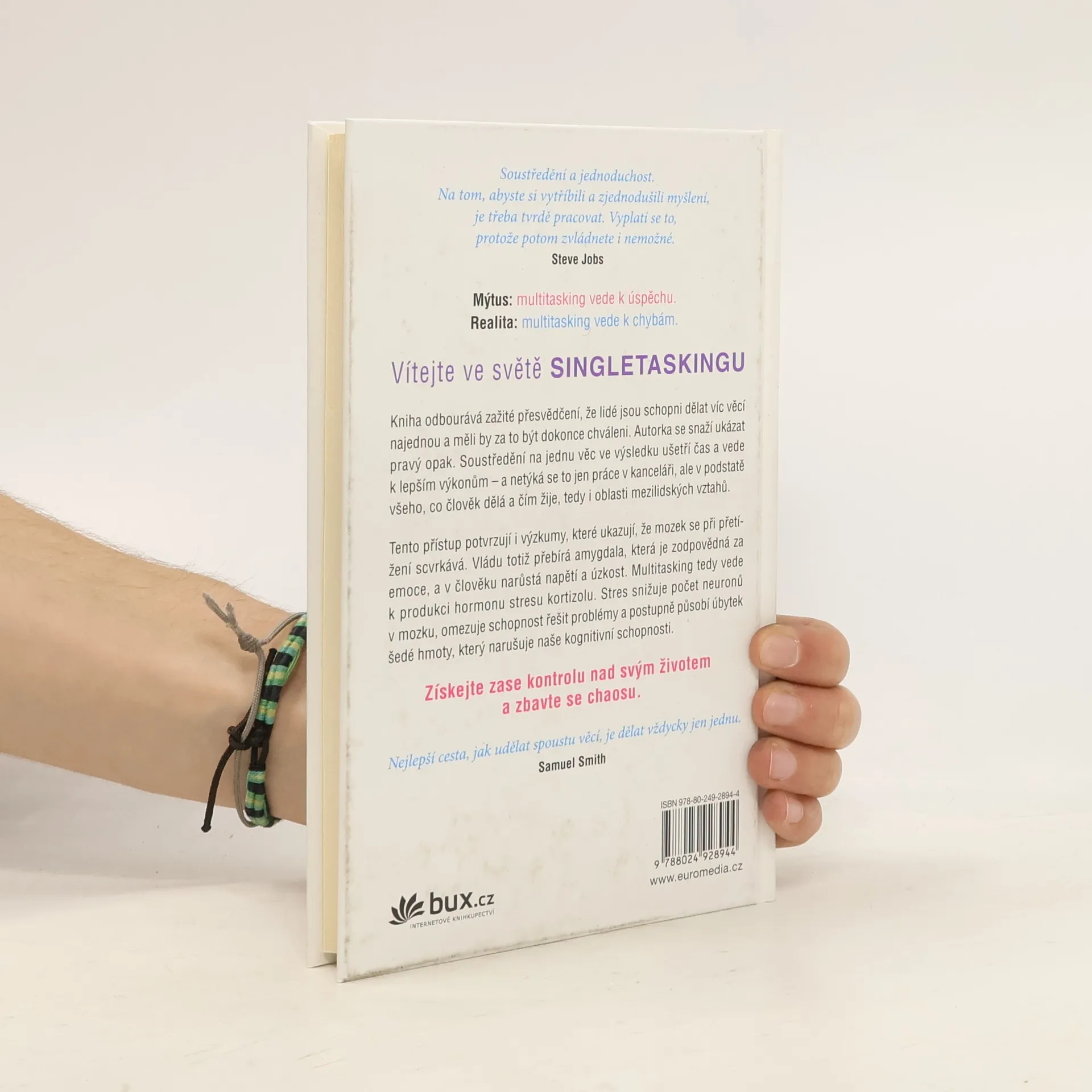 Kniha odbourává mýtus, že lidé jsou schopni dělat víc věcí najednou a že by za to měli být dokonce chváleni. Autorka se snaží ukázat, že je to přesně naopak. Soustředění na jednu věc ve výsledku ušetří čas a vede k lepším výkonům – a netýká se to jen práce v kanceláři, ale v podstatě všeho, co člověk dělá a čím žije, tedy i oblasti mezilidských vztahů. Text je psaný čtivě a doprovázejí ho různé testy se zábavně pojatým vyhodnocením.
