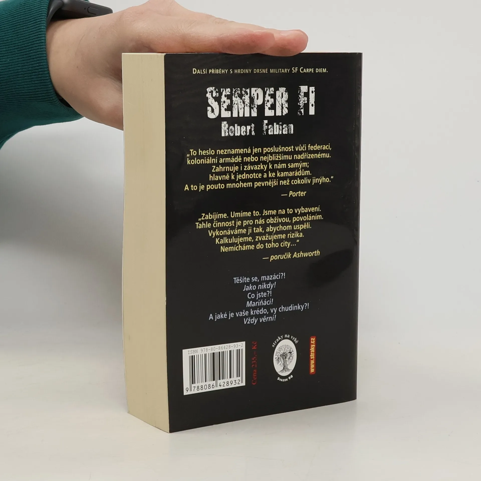 „To heslo neznamená jen poslušnost vůči federaci, koloniální armádě nebo nejbližšímu nadřízenému. Zahrnuje i závazky k nám samým; hlavně k jednotce a ke kamarádům. A to je pouto mnohem pevnější než cokoliv jinýho."Porter„Zabíjíme. Umíme to. Jsme na to vybavení. Tahle činnost je pro nás obživou, povoláním. Vykonáváme ji tak, abychom uspěli. Kalkulujeme, zvažujeme rizika. Nemícháme do toho city…"poručík AshworthTěšíte se, mazáci?!Jako nikdy!Co jste?!Mariňáci!A jaké je vaše krédo, vy chudinky?!Vždy věrní!