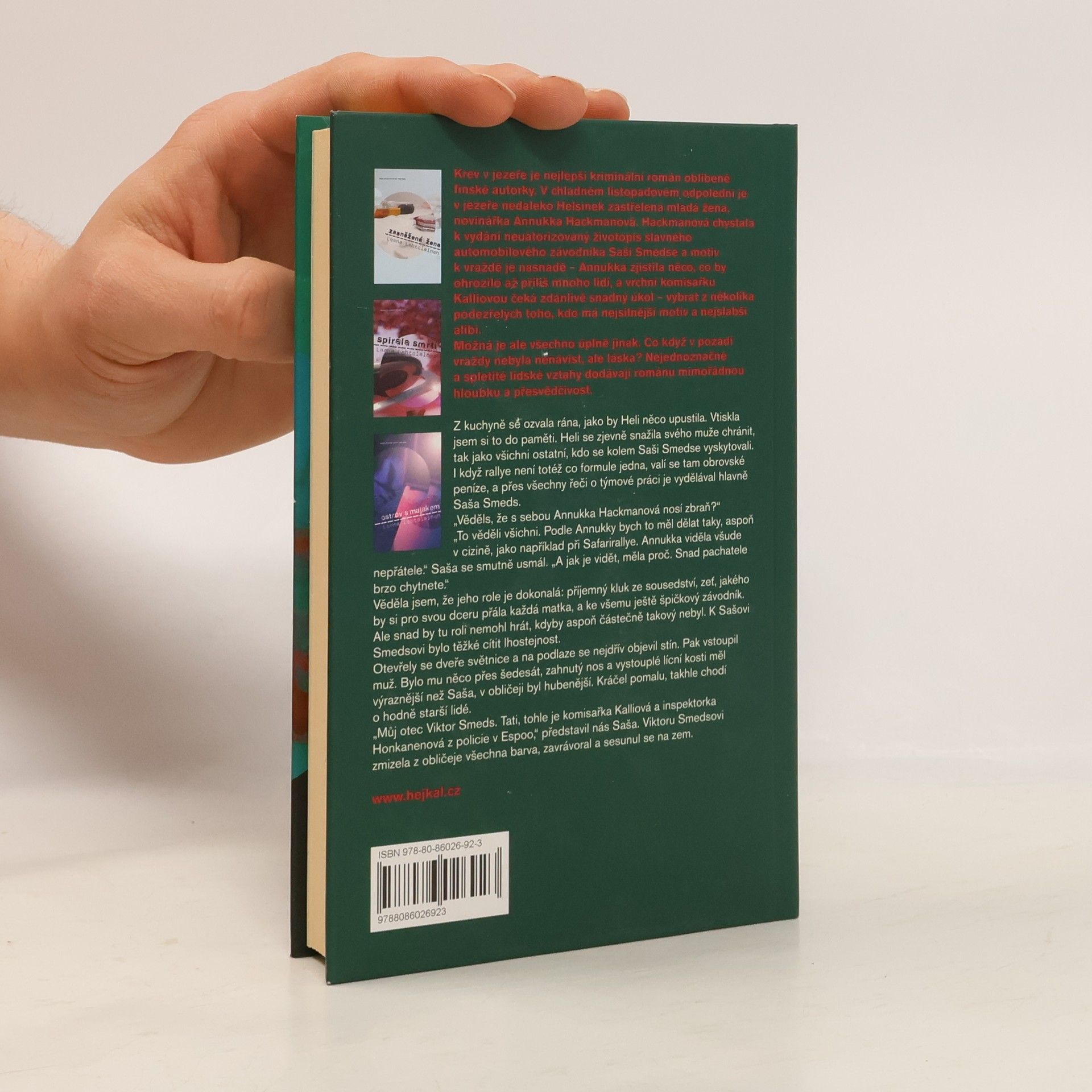 Krev v jezeře je nejlepší kriminální román oblíbené finské autorky. V chladném listopadovém odpoledni je v jezeře nedaleko Helsinek zastřelena mladá žena, novinářka Annukka Hackmanová. Hackmanová chystala k vydání neautorizovaný životopis slavného automobilového závodníka Saši Smedse a motiv k vraždě je nasnadě - Annukka zjistila něco, co by ohrozilo až příliš mnoho lidí, a vrchní komisařku Kalliovou čeká zdánlivě snadný úkol - vybrat z několika podezřelých toho, kdo má nejsilnější motiv a nejslabší alibi. Možná je ale všechno úplně jinak