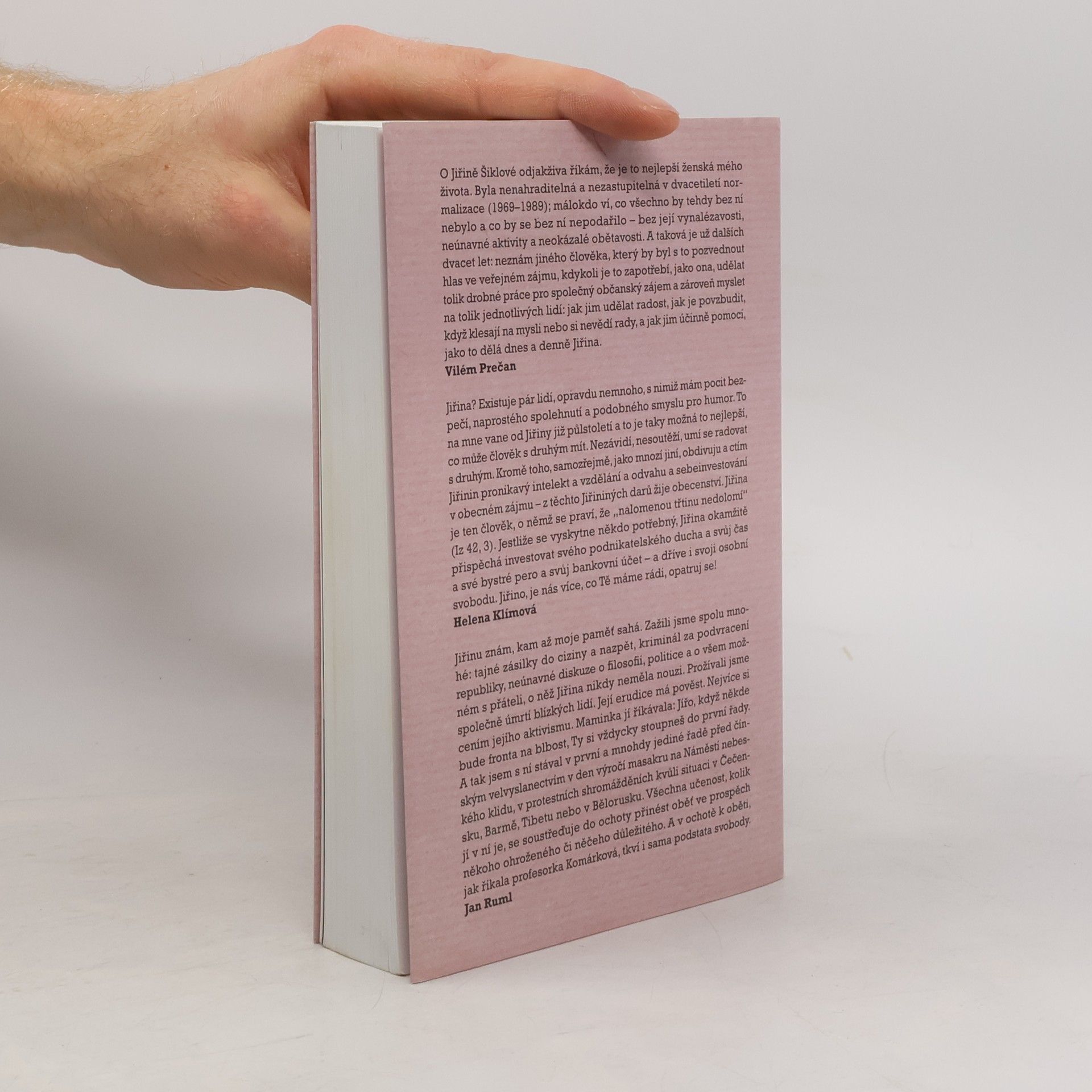 Knižní rozhovor s Jiřinou Šiklovou (1935) supluje memoáry, které uznávaná socioložka a pedagožka zřejmě nikdy nenapíše. Víc než minulost ji totiž zajímají přítomné okamžiky naší společnosti, které břitce a s nadhledem neustále komentuje. Její vzpomínky jsou přitom košaté, detailní a glosátorské. Šiklová v knize podrobně líčí ilegální kurýrní kanál, přes který se do Československa v době normalizace dostávaly exilové časopisy a v zahraničí vydané knihy doma zakázaných autorů. Šiklová si jako významná spojka mezi disidenty a exilem počínala velmi neohroženě. Rozvinula k dokonalosti své konspirativní schopnosti, takže zůstala až do zatčení v roce 1981 neodhalena. Rozhovor s Jiřinou Šiklovou je životopisným líčením sebeironické intelektuálky, která každé své rozhodnutí zpětně analyzuje: svůj vstup do KSČ, roli při Pražském jaru, politickou perzekuci, kurýrní práci, roční vězení i porevoluční aktivity včetně založení Genders Studies. Stranou nezůstalo ani její soukromí, které je, jak se ukazuje, často skrytou motivací významných rozhodnutí