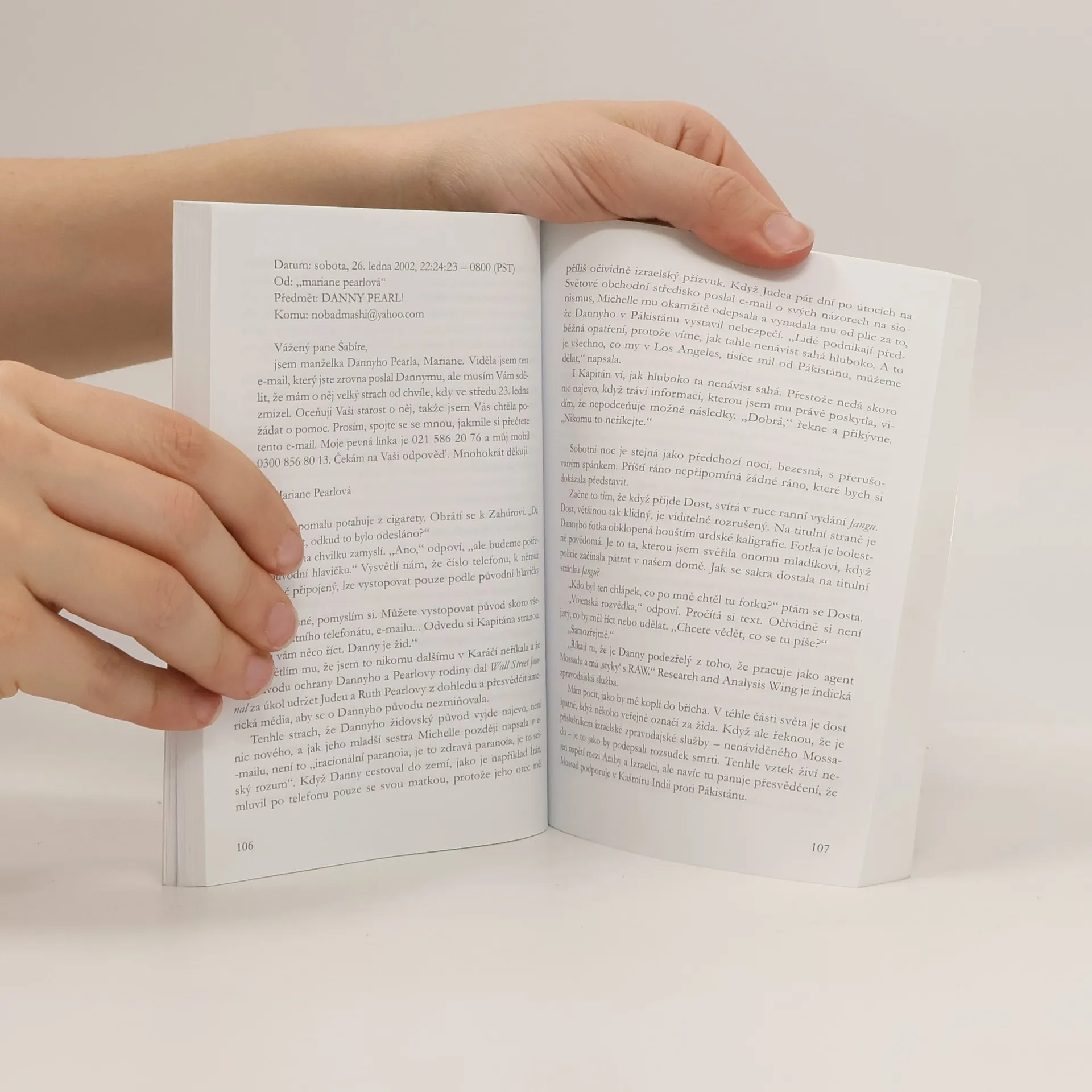 Příběh na pomezí beletrie a literatury faktu, který byl rovněž zfilmován, líčí okolnosti únosu, zorganizovaného muslimskou teroristickou skupinou. Mariane a její indická přítelkyně Asra spolupracují s týmem vyšetřovatelů ve snaze Daniela osvobodit. Jejich horečné úsilí sice nakonec vede k odhalení pachatelů, nikoli však k záchraně uneseného. V příběhu poznáváme řadu čestných, odhodlaných a schopných lidí různých vyznání a národnosti, kteří společně pracují na záchraně novináře a zároveň chrání jeho ženu. Poznáváme, že fanatická nenávist teroristů (a mnohdy i prostých lidí Východu) je živena náboženskou propagandou, ale hlavně naprostou neznalostí života a myšlení lidí na Západě. (Bohužel to však platí i opačně.) Příběh napsaný manželkou uneseného novináře je velmi působivý a emotivní a zdůrazňuje důležitost vzájemného poznávání a pochopení kultur a náboženství celého světa.