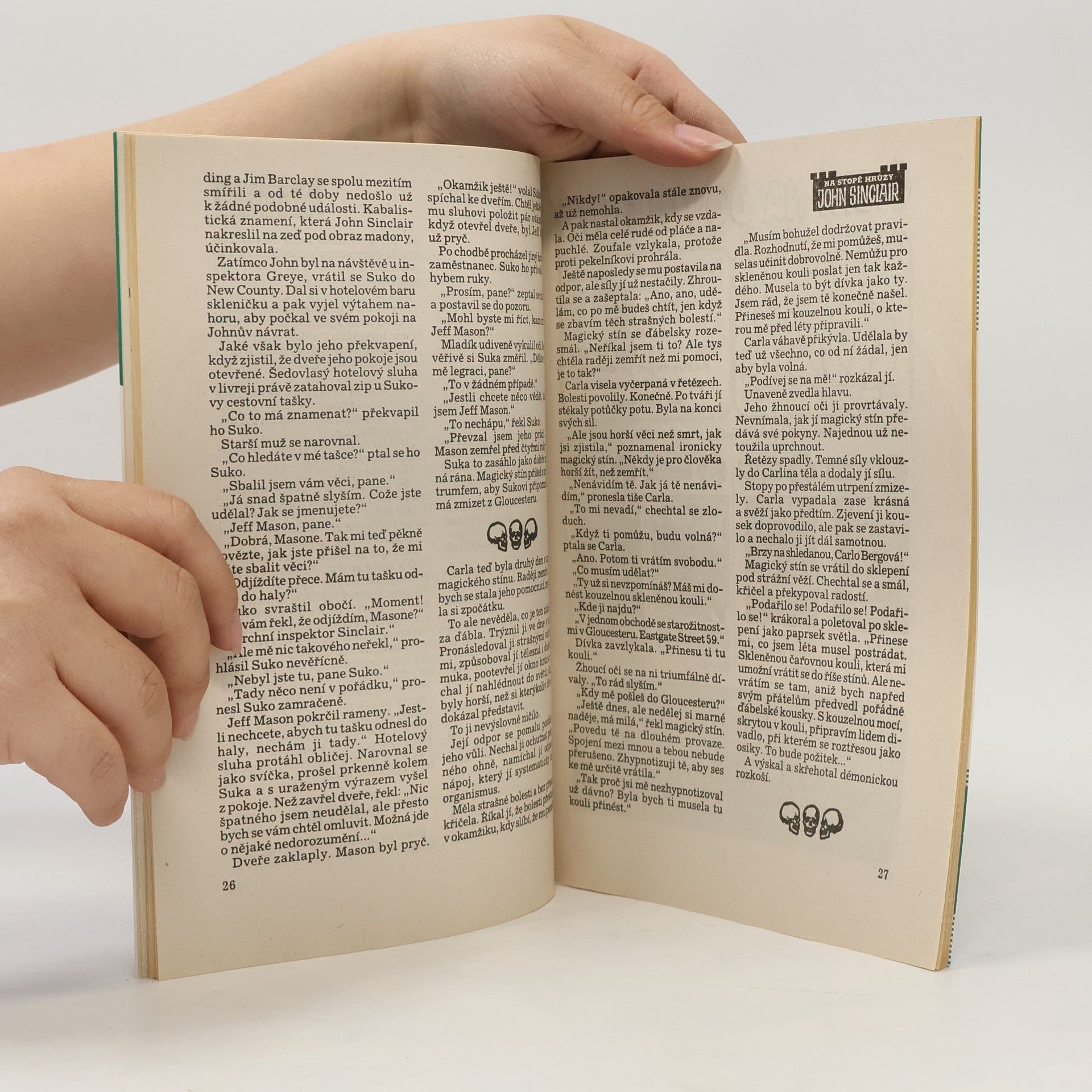 Ze stropu se spouštěl velký vypasený pavouk a kýval se Carle před očima. Netopýři se zuby jako nože a doširoka otevřenými tlamičkami neslyšně poletovali po sklepení. Jeden z kostlivců k ní natáhl ruku na uvítanou. Jeho kosti zachrastily. Carla ucítila studený dech smrti. Rozkřičela se jako smyslů zbavená, až jí selhal hlas.