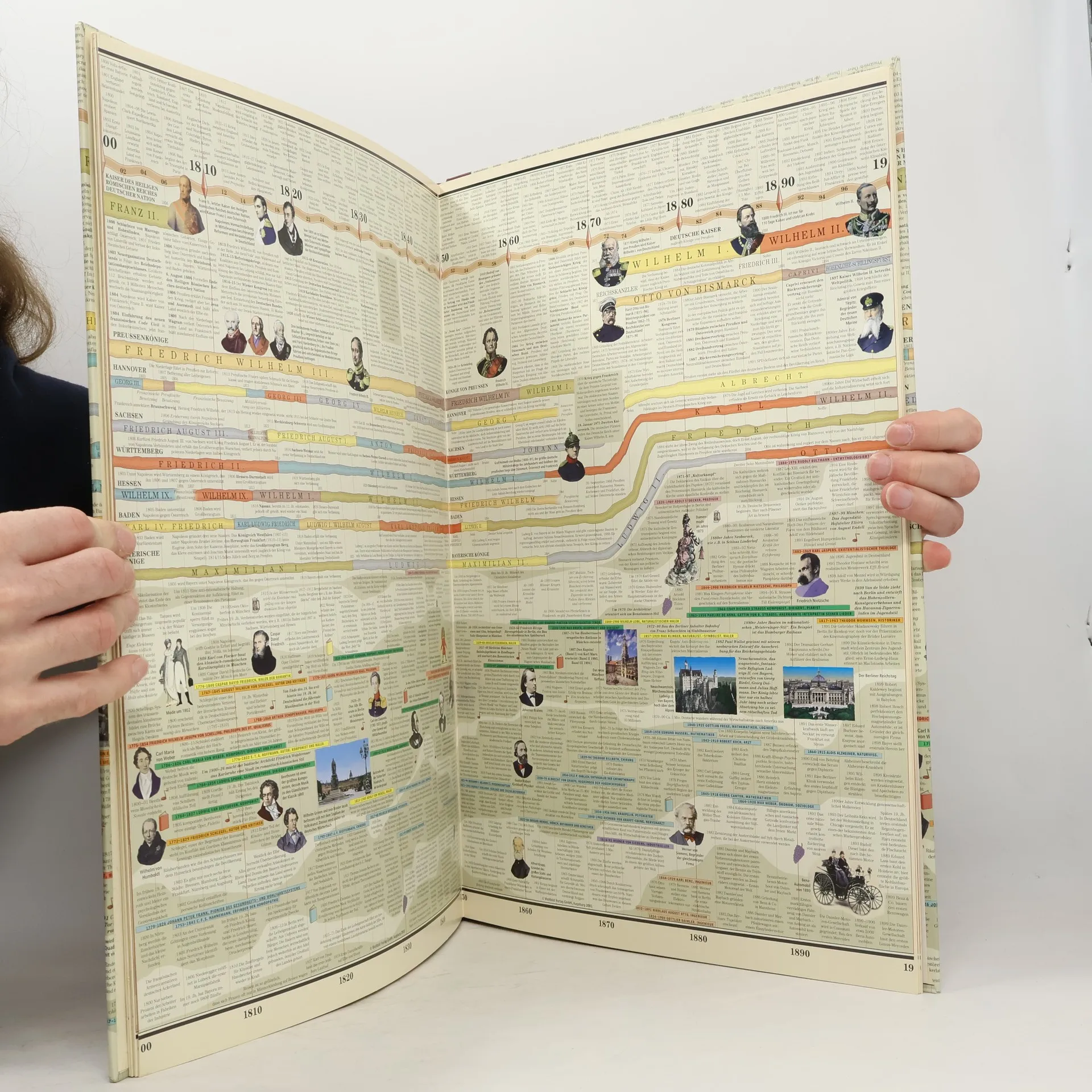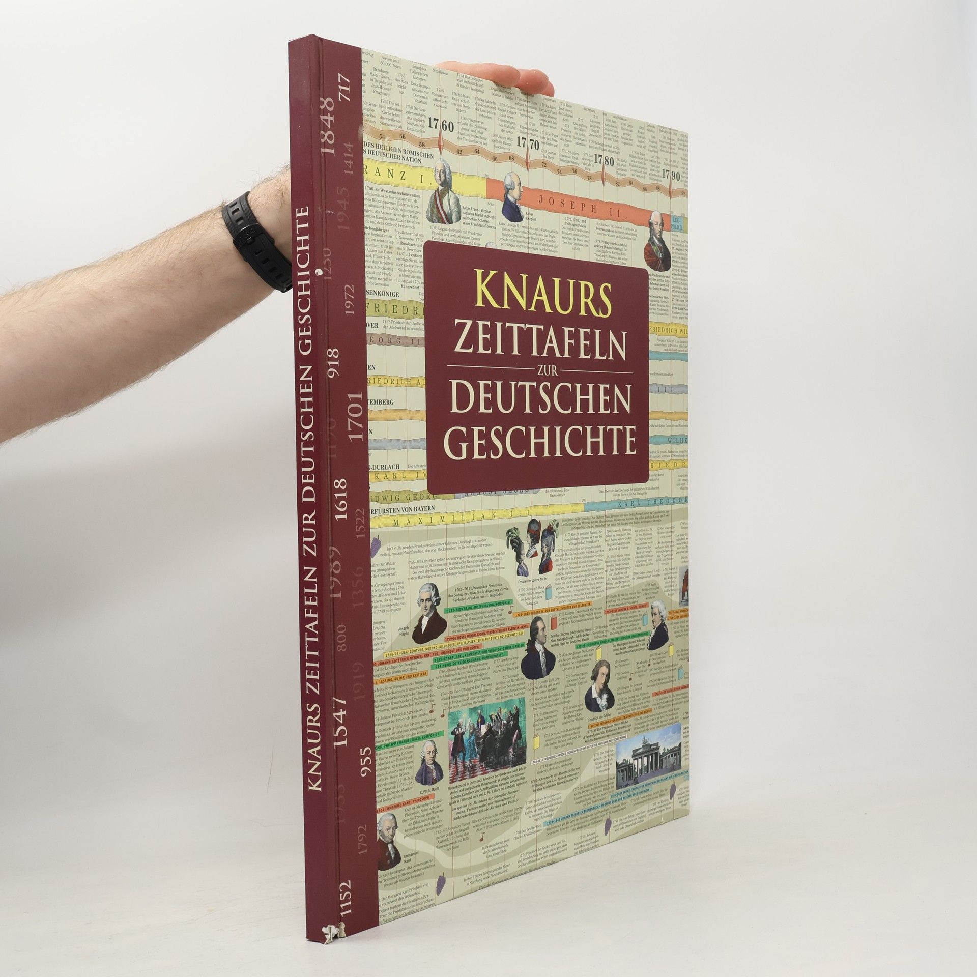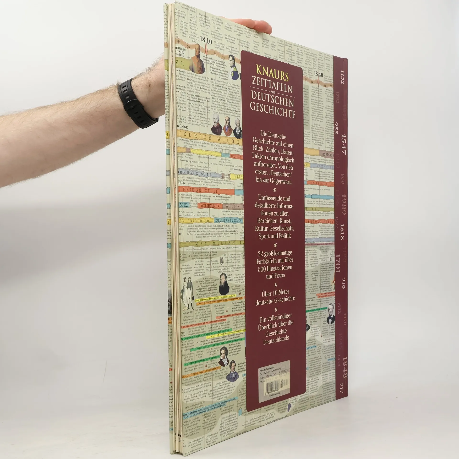 Geschichte ist stets im Fluss. Die Entwicklung Deutschlands von den germanischen Stammesverbänden bis in die Gegenwart war kein kontinuierlicher Prozess. Wohl nirgends wird dies deutlicher als in "Knaurs Zeittafeln zur deutschen Geschichte". Sie laden historisch interessierte zu einer lehrreichen und unterhaltsamen Entdeckungsreise ein. Großformatige Ausklapptafeln mit einem breit angelegten Zeitstrahl bieten einen detaillierten Überblick über die politischen, wirtschaftlichen, sozialen und kulturellen Entwicklungen der deutschen Gesellschaft von der Völkerwanderung bis in die Gegenwart. Historisches Kartenmaterial und ausführliche Abhandlungen z. B. über die Entwicklung der Naturwissenschaften oder die deutsche Literatur und Philosophie auf Doppel-Ausklapptafeln vervollständigen dieses monumentale Geschichtswerk.