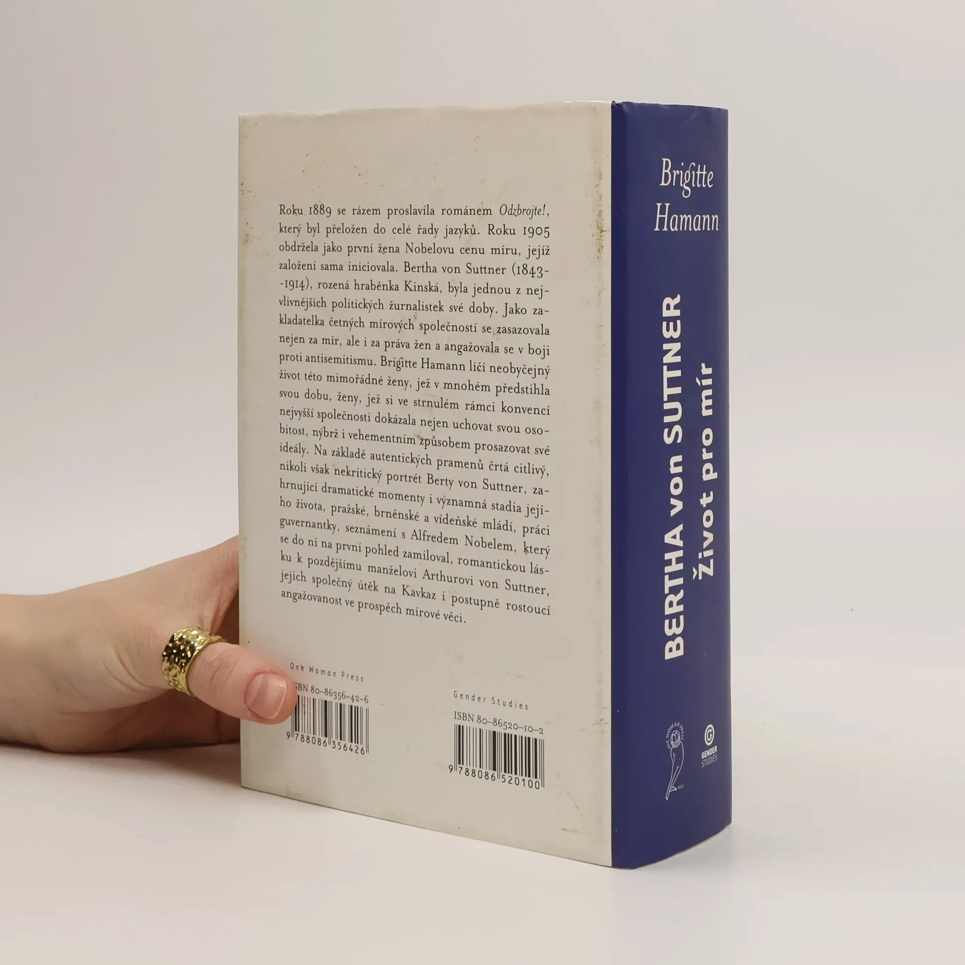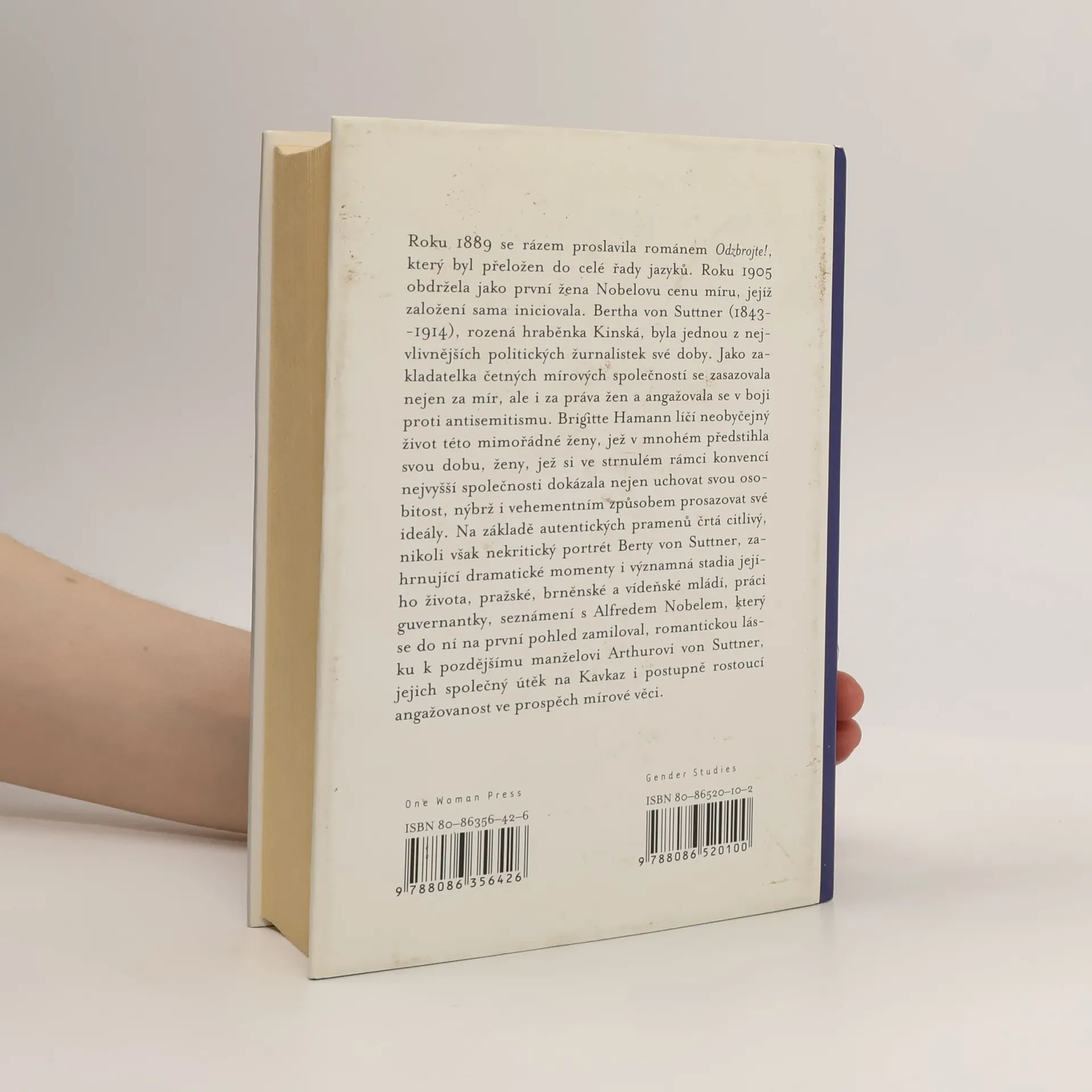 Obsáhlá, reprezentativní monografie první nositelky Nobelovy Ceny za mír (1905). Roku 1889 se rázem proslavila románem Odzbrojte!, který byl přeložen do celé řady jazyků. Roku 1905 obdržela jako první žena Nobelovu cenu míru, jejíž založení sama iniciovala. Bertha von Suttner (1843- -1914), rozená hraběnka Kinská, byla jednou z nejvlivnějších politických žurnalistek své doby. Jako zakladatelka četných mírových společností se zasazovala nejen za mír, ale i za práva žen a angažovala se v boji proti antisemitismu. Brigitte Hamann líčí neobyčejný život této mimořádné ženy, jež v mnohém předstihla svou dobu, ženy, jež si ve strnulém rámci konvencí nejvyšší společnosti dokázala nejen uchovat svou osobitost, nýbrž i vehementním způsobem prosazovat své ideály. Na základě autentických pramenů črtá citlivý, nikoli však nekritický portrét Berty von Suttner, zahrnující dramatické momenty i významná stadia jejího života, pražské, brněnské a vídeňské mládí, práci guvernantky, seznámení s Alfredem Nobelem, který se do ní na první pohled zamiloval, romantickou lásku k pozdějšímu manželovi Arthurovi von Suttner, jejich společný útěk na Kavkaz i postupně rostoucí angažovanost ve prospěch mírové věci.